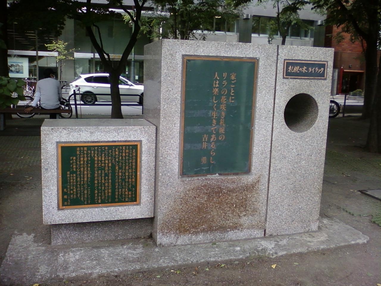 「札幌の木ライラック」歌碑は、札幌の大通り公園にあります。場所は札幌駅前通り、泉の像の近くにあります、斜め向かいくらいには石川啄木の歌碑もありますね。吉井勇という有名な歌人の描かれた歌が彫られていて、その脇には札幌ライラックまつりなどの説明もされています。札幌とライラックとの深い関わり、春の訪れの喜びを感じさせる内容の歌碑です。通り過ぎてしまいがちですが、特に春のライラックの季節、この歌碑を眺めてから散策すると、また思い入れも違うかな、と思います。