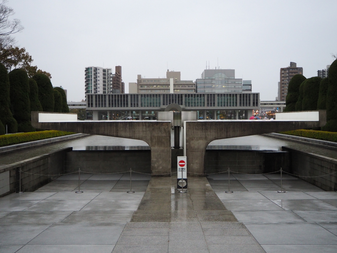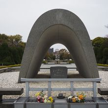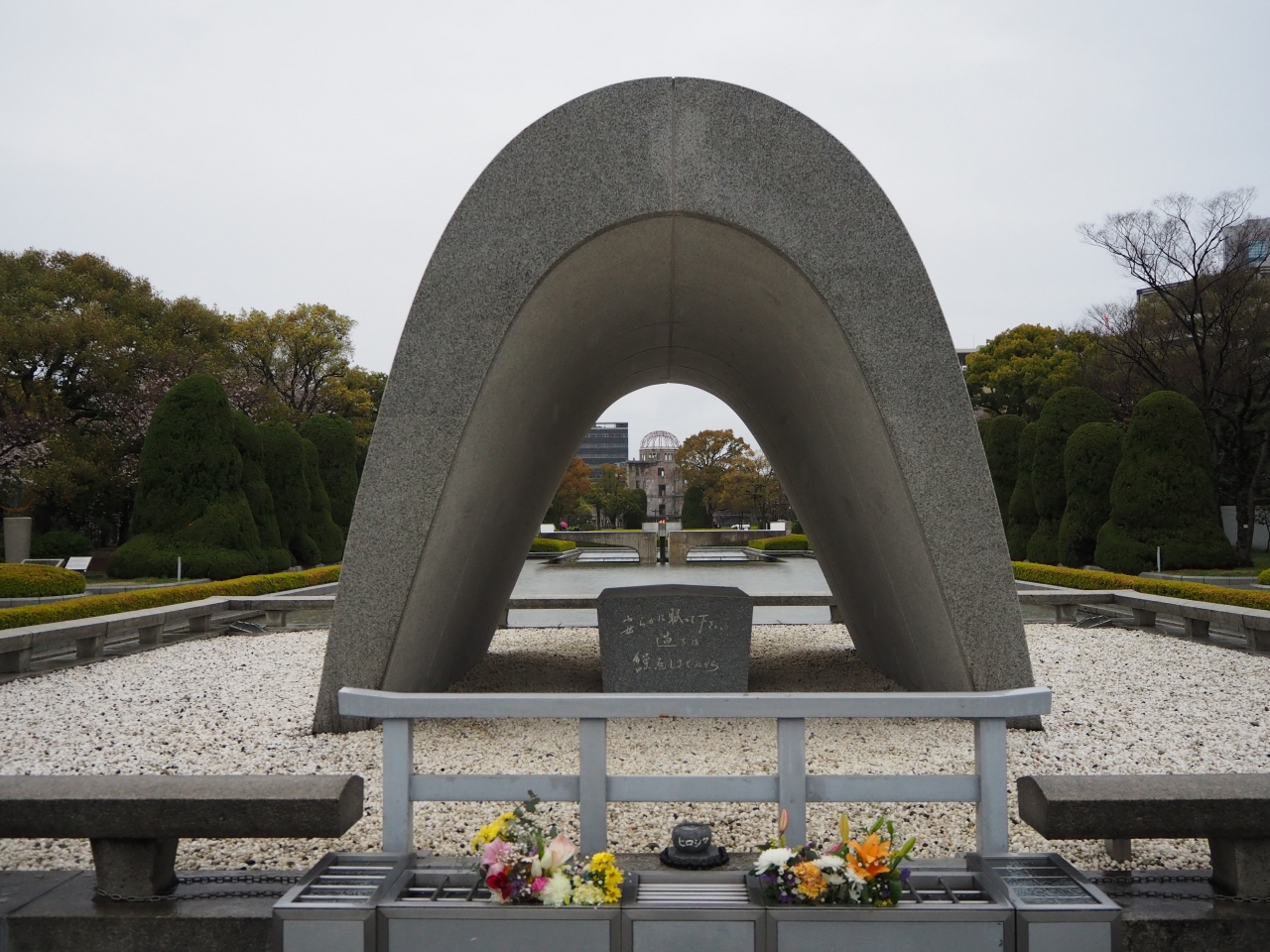 元安川と太田川に囲まれた平和公園内に設置されている被爆者への冥福と核戦争を二度と起こさない誓いの碑です。戦後独立を果たした1952年8月6日に設置されました。平和記念資料館と原爆ドームの線状にあり、この碑の前で祈ると先に原爆ドームが見えます。
