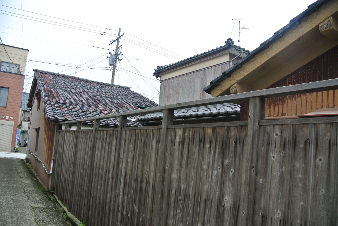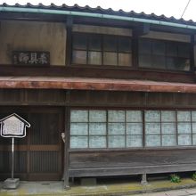 間口はそれほど広くないのですが、敷地と建物が奥に長く延びているのが特徴です。なので、正面から見たあとは建物横の道を奥まで歩いてみることをおすすめします。中には入れず外見だけの見学ですが、正面玄関に石碑と説明書きが設置されています。
