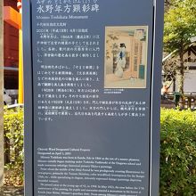 御神殿裏手の末廣稲荷神社の右脇にある、石の笠が付いた石柱です。水野年方とは江戸から明治にかけての浮世絵師で「三十六佳撰」などの作品があります。顕彰碑の説明版に絵が一枚ありますが美人画も多かったようです。碑には多くの門弟の名前があり影響力の大きい浮世絵師であったことがうかがい知れました。