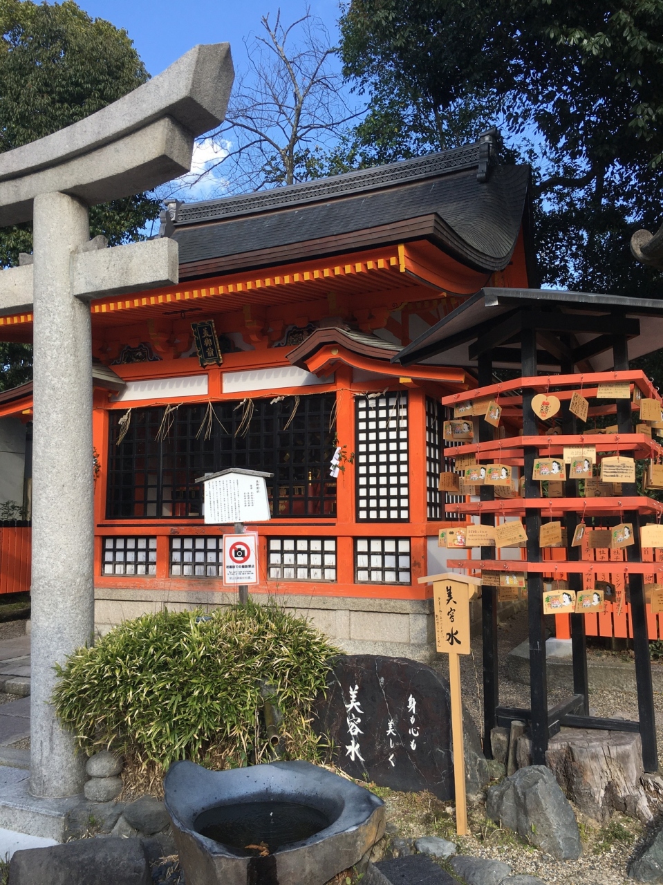 鳥居を潜ると直ぐに社殿の小さな神社でした。赤い神社なのでひときわ目立っていました。横には絵馬がたくさん奉納され、その前には美容水というのが竹筒から流れ石の桶にちょろちょろと流れていました。後方には木々が生えています。