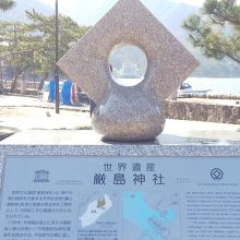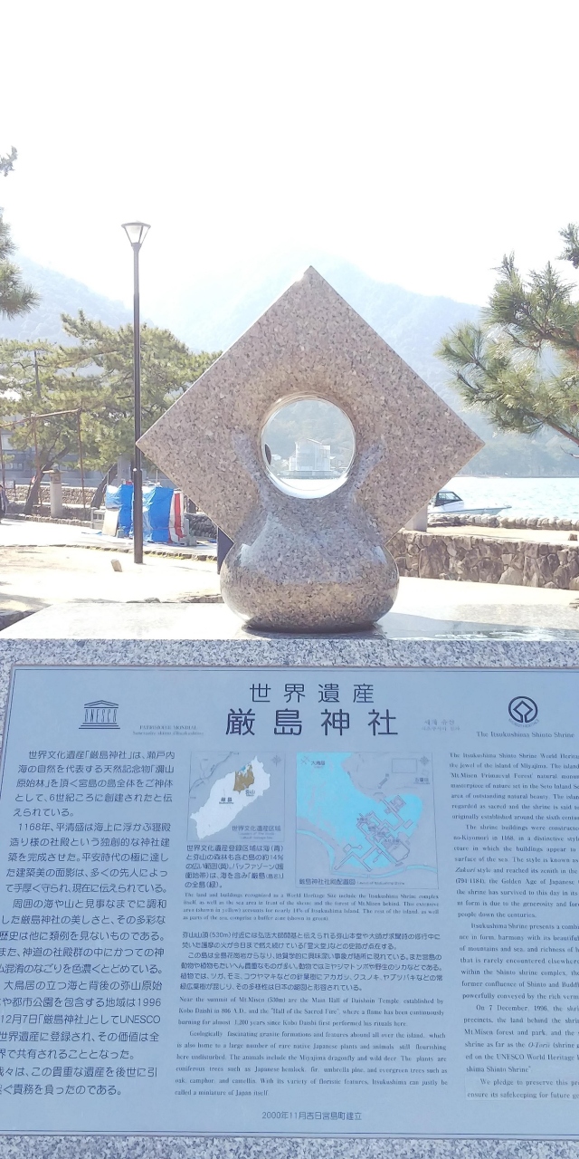 一月に仕事で広島に行き、早く終わったので、日本三景の宮島に行きました。世界遺産に登録された記念碑がフェリーターミナルの厳島神社に向かう途中にたてられています。丸い穴からはうまいこと海上の大鳥居が見えるようになっていますよ。ぜひのぞいてみましょう。