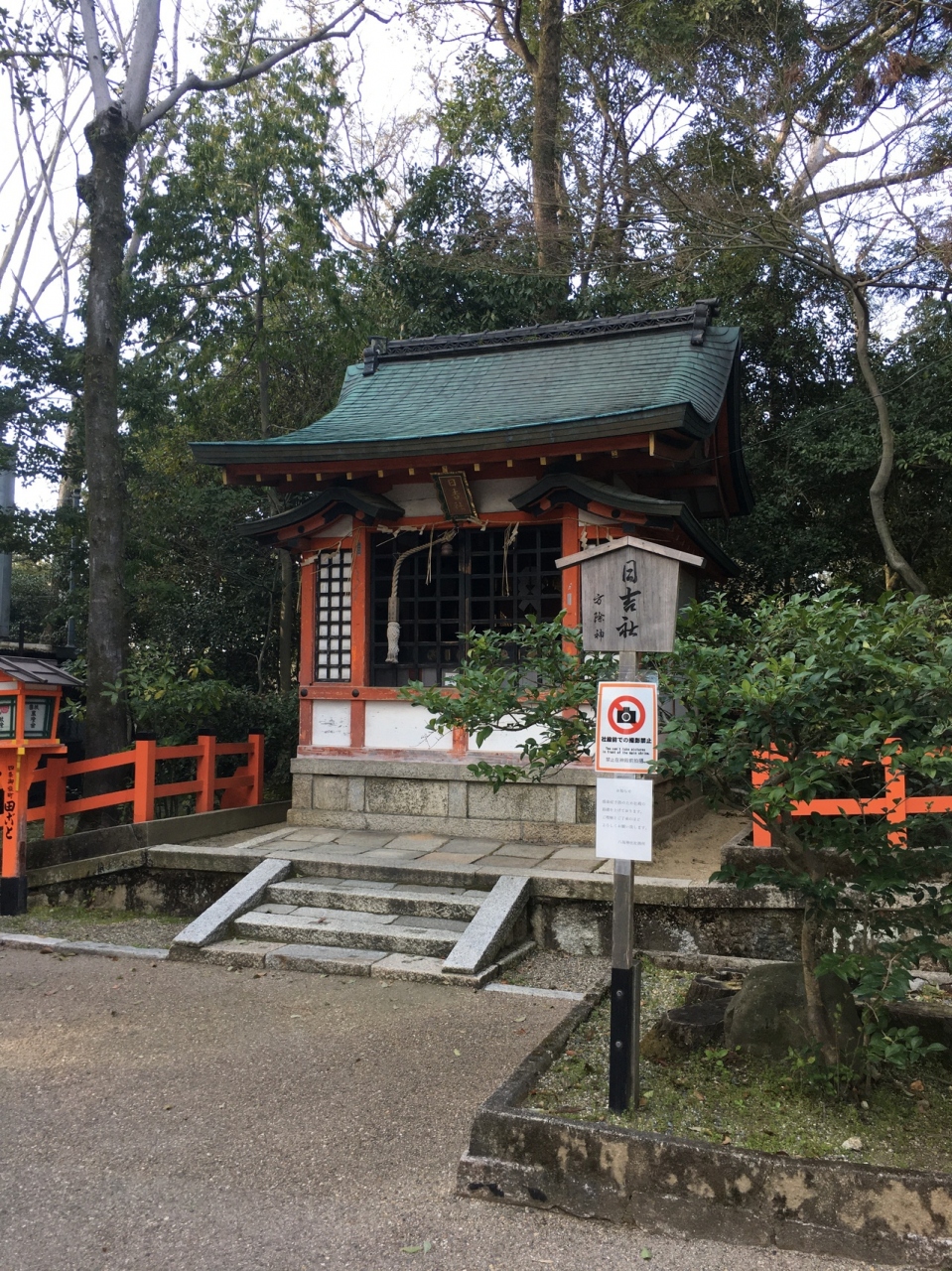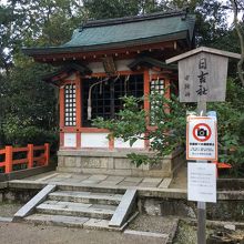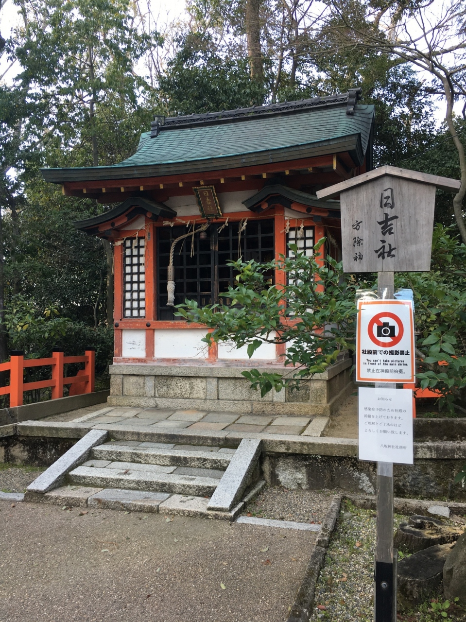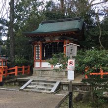 赤い小さな社殿で、細いしめ縄があり鈴が上にありました。石の土台の上にあり、階段を僅か4段上がったらお参りが出来ます。緑の屋根でしたが後方に木々が生え、木々の葉のほうが鮮やかな色でした。鳥居がない社でした。