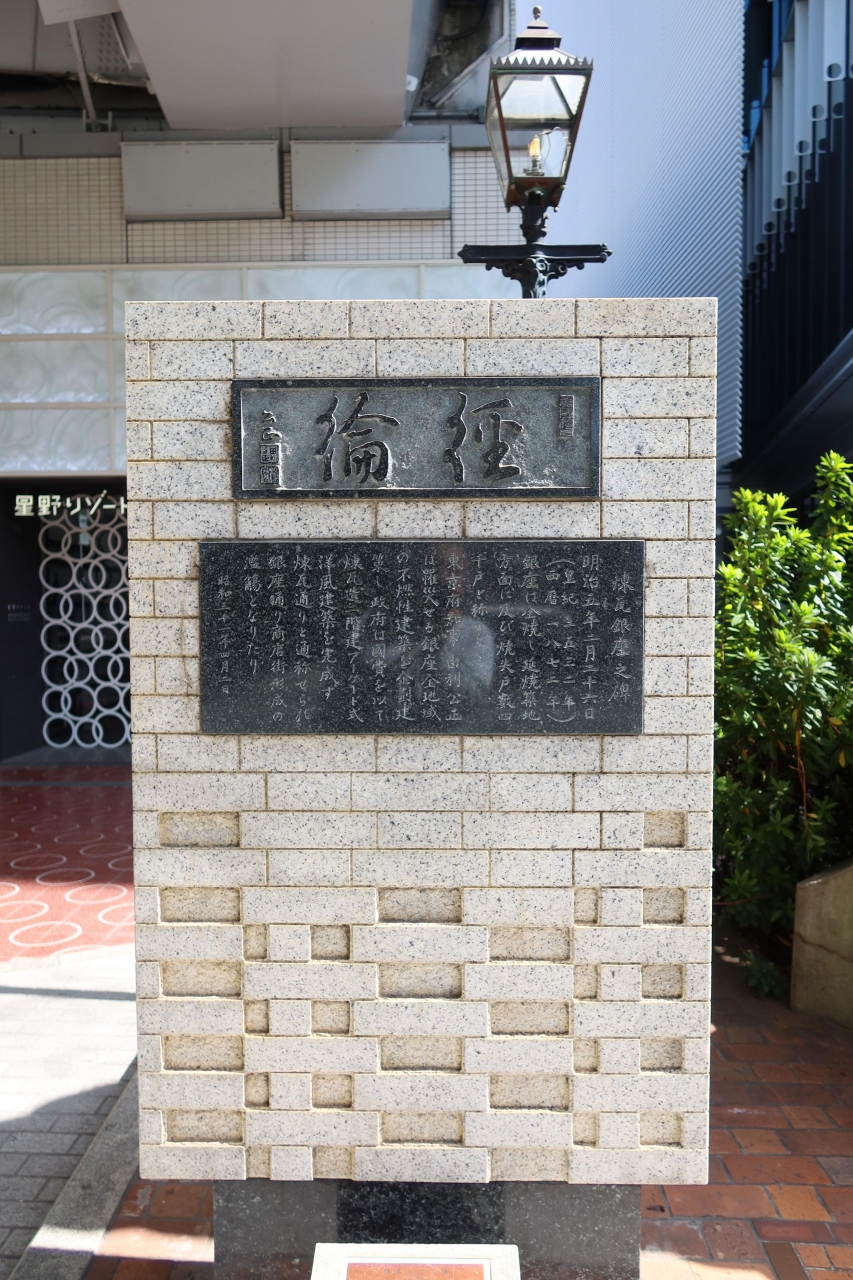 銀座一丁目の中央通りに残る京橋が架けられていた首都高速の高架下に銀座煉瓦之碑とガス灯があります。ガス灯と京橋の親柱を間違える人がいますが、ガス灯は銀座煉瓦之碑の後ろにある金属製の街灯です。そして、銀座煉瓦之碑は明治期に銀座を不燃の街として築いた由利公正の称える碑です(碑の下部煉瓦はフランス積み)。明治期近代都市が銀座から作られていったことが分かる記念碑とガス灯です。