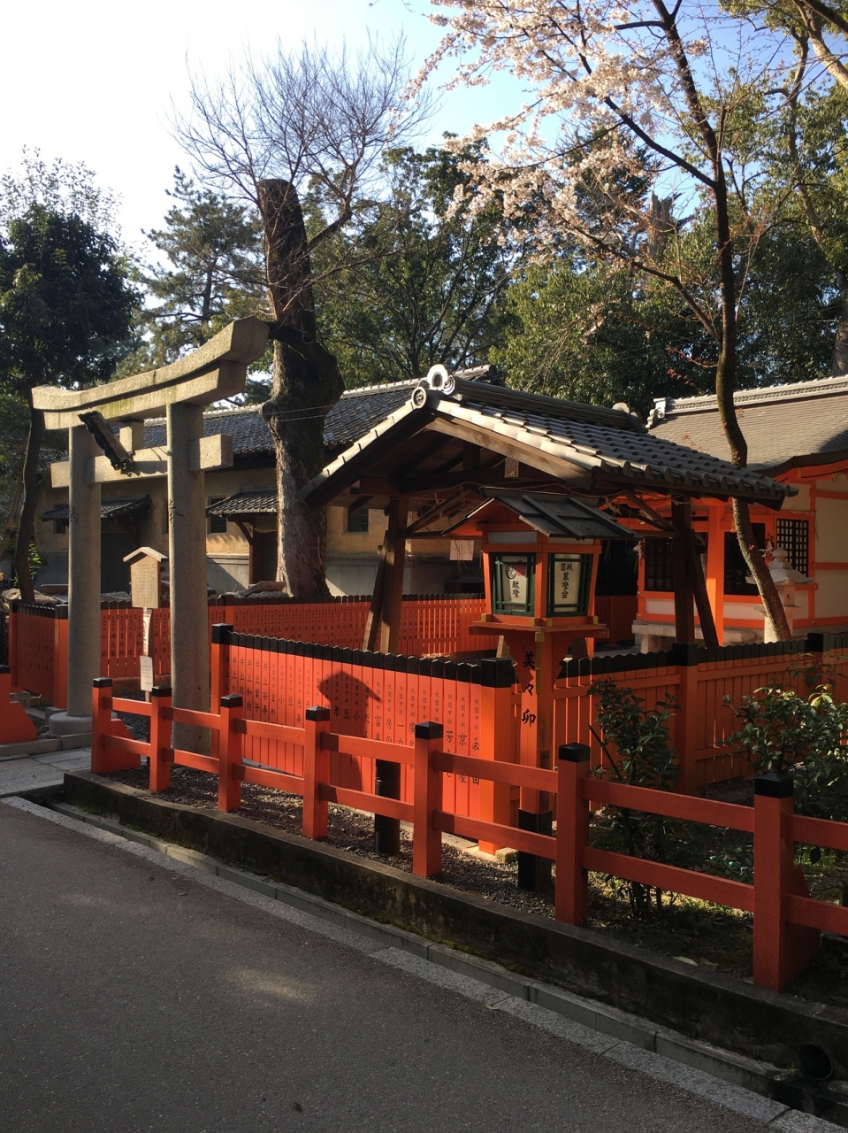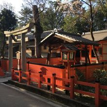 社殿も、社殿を囲む柵もオレンジ色が少し混ざったような朱色でしたが、鳥居がグレーで古めかしかったです。鳥居の右側に大きな木があり、切ったばかりのようで少し殺風景さがある景観でした。鳥居潜ったら直ぐに社殿です。