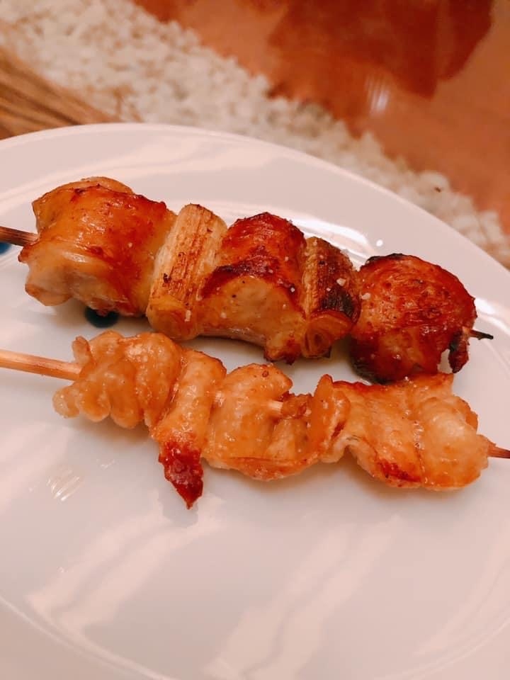 今回は、白レバー・鳥皮・ねぎま・砂肝・赤豚・月見つくね・精肉・比内地鶏ラーメンを注文。