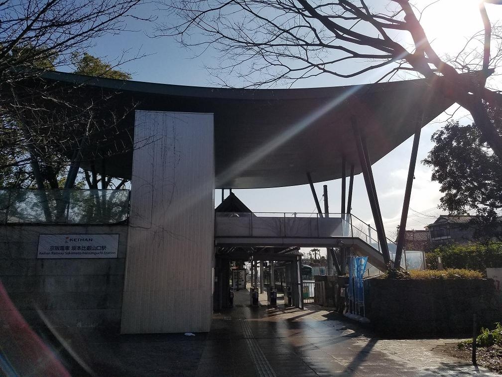 京阪大津線は、京都山科から大津経由で比叡山の麓の坂本を結ぶ路線です。浜大津から坂本までの路線は、カラフルな2両編成で琵琶湖近くの住宅街から高台まで長閑な景色の中を走ります。終点の坂本比叡山口駅は、コンパクトながらモダンな外観で、昔ながらの街並みが魅力な界隈の景色と対象的でした。