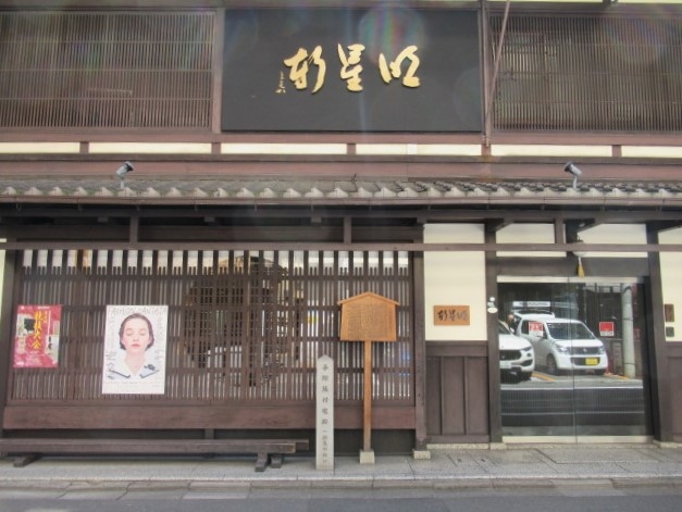 啓明商事(株)という老舗の呉服屋さんの前に建っていてその上には達筆に書かれた額が掛かっています。「明星軒」と書かれています。読めませんよね。