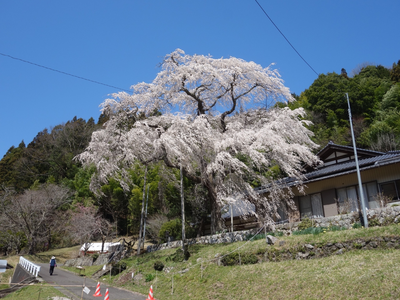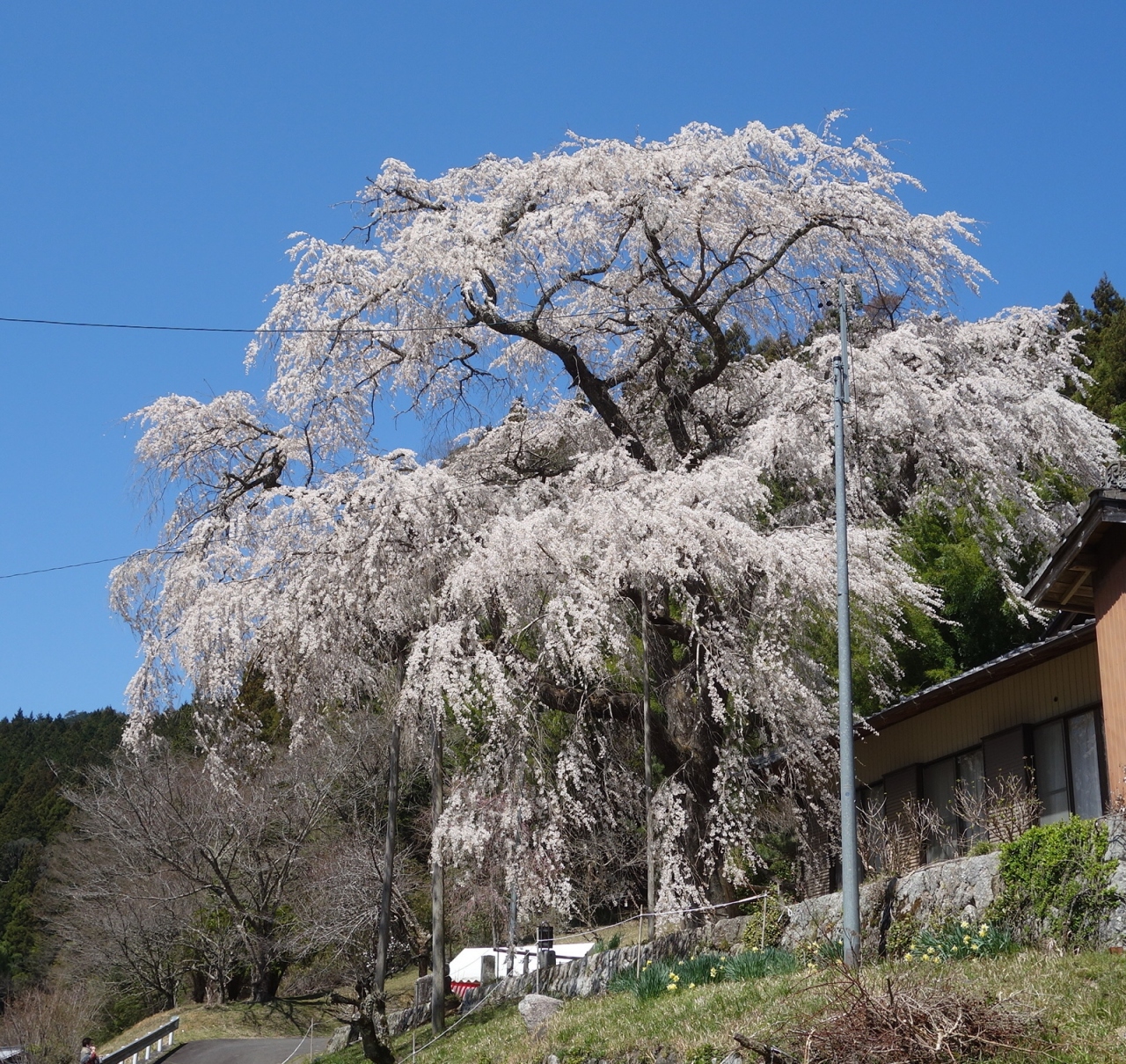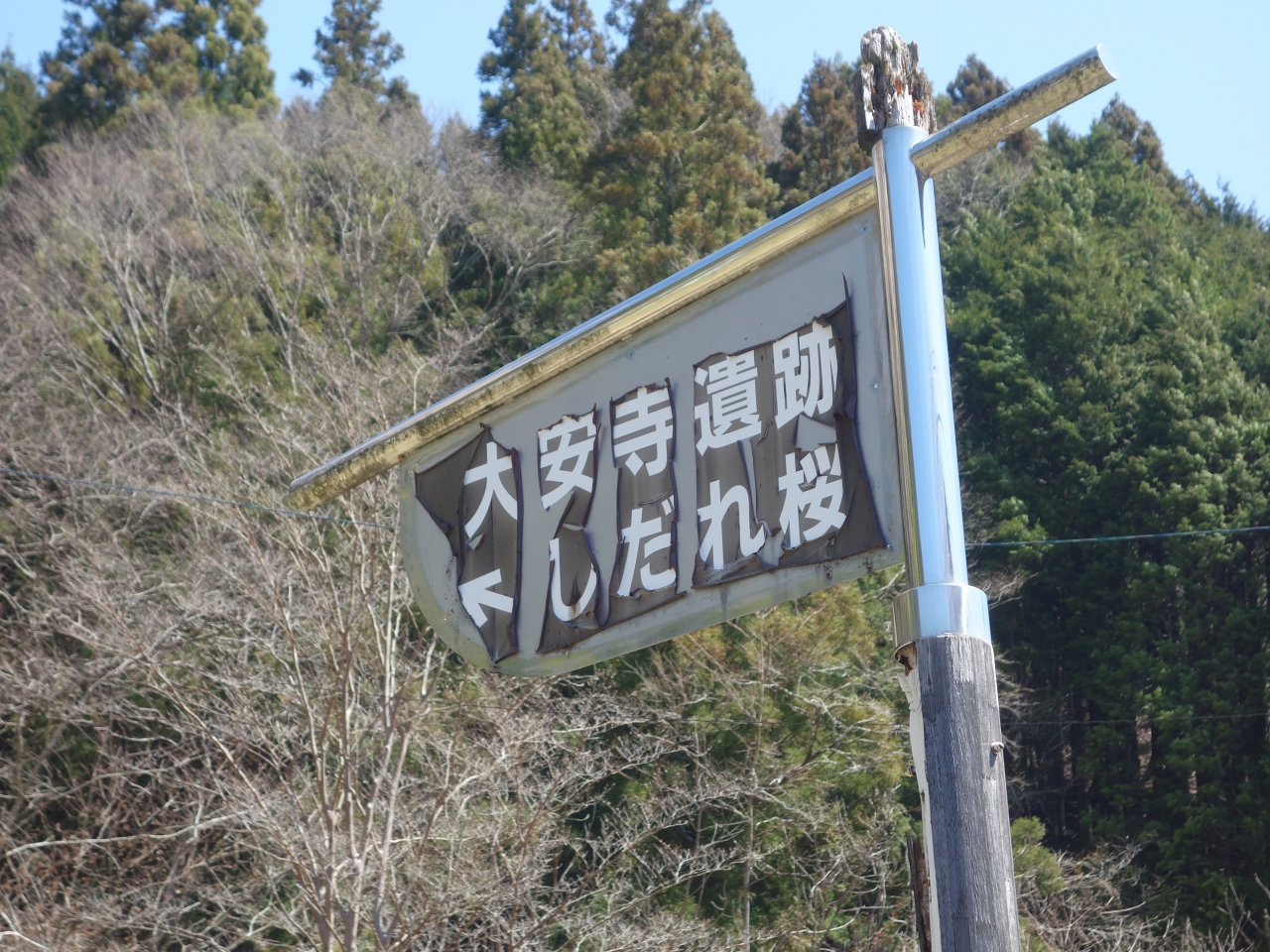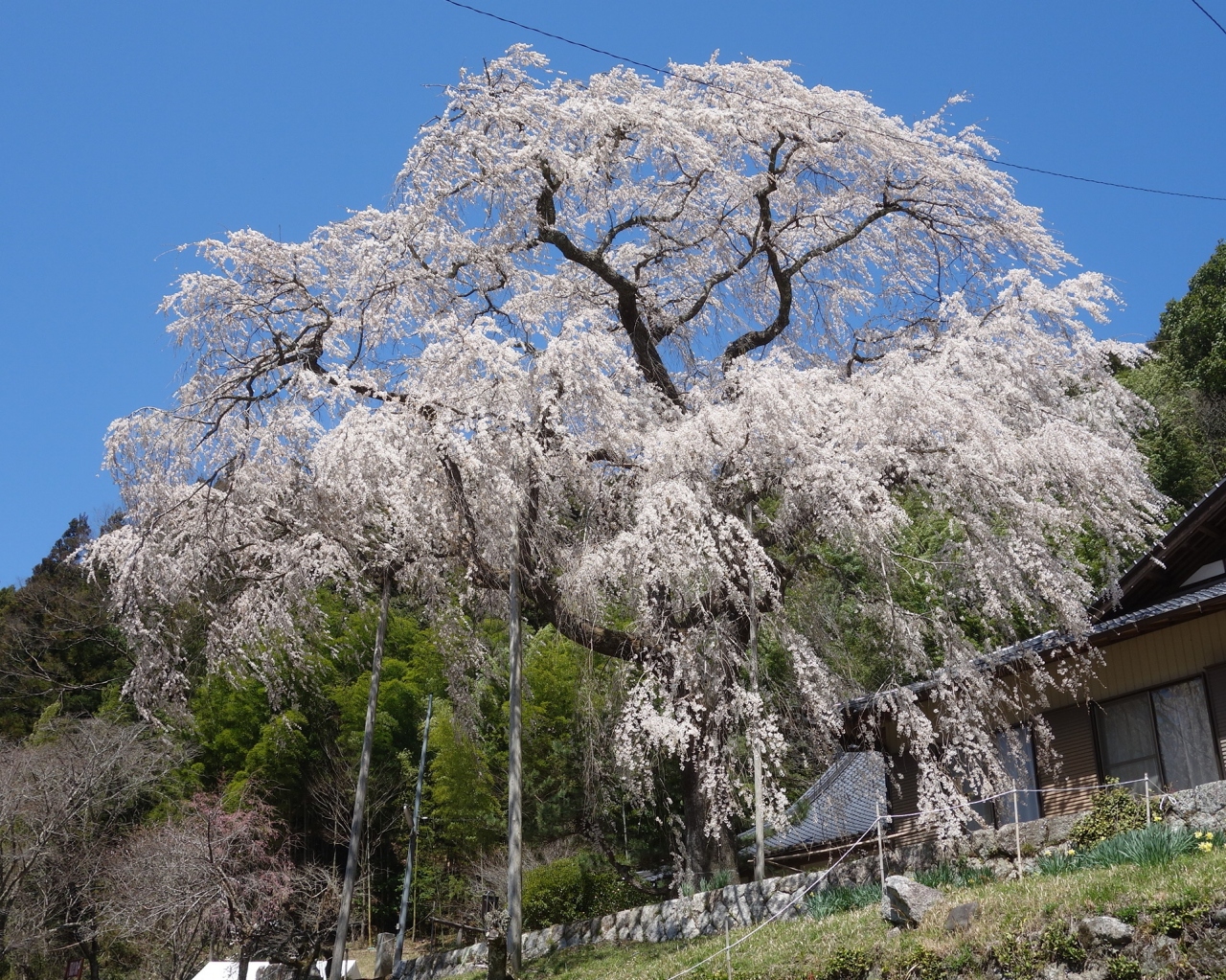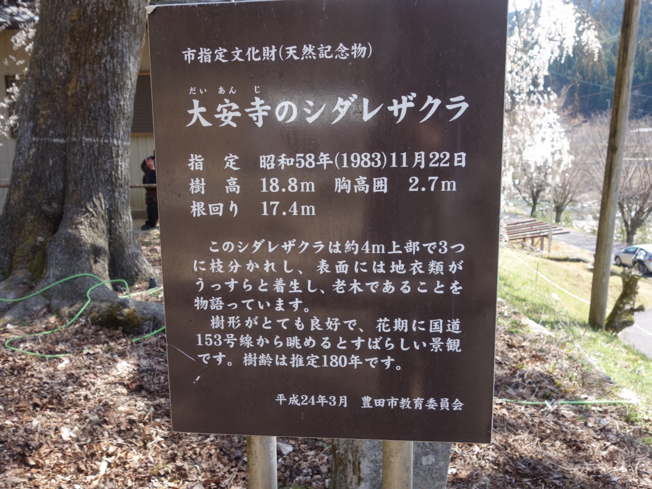 大安寺のしだれ桜。樹齢250年。豊田市指定の天然記念物です。稲武の交差点から国道153号線をさらに飯田に向って8キロほど行ったところにあります。国道から一本西にはいります。国道からもよく見えます。ととも背のたかい木で立派です。ここも必見の桜です。