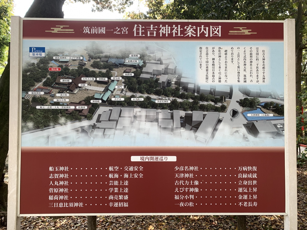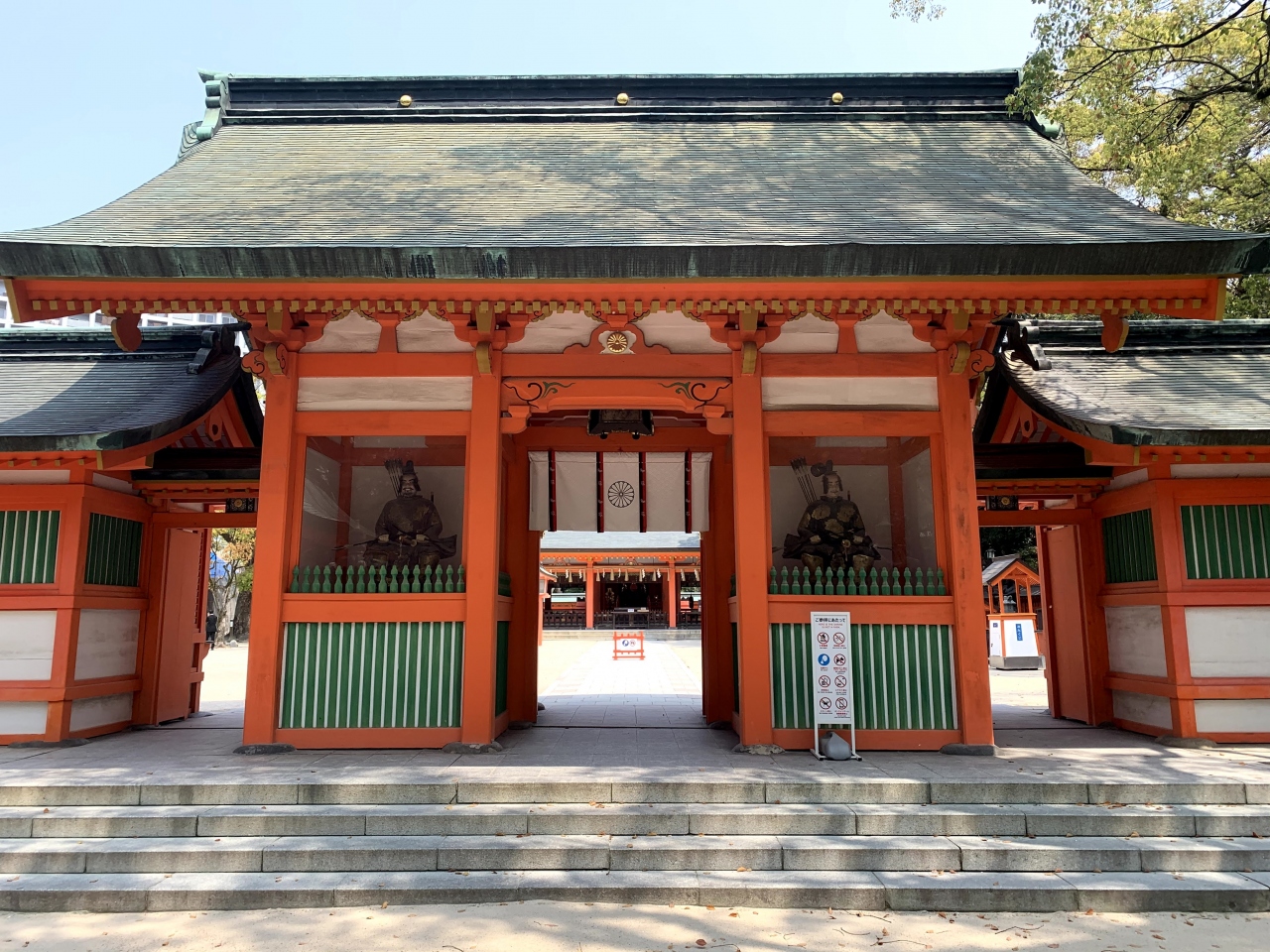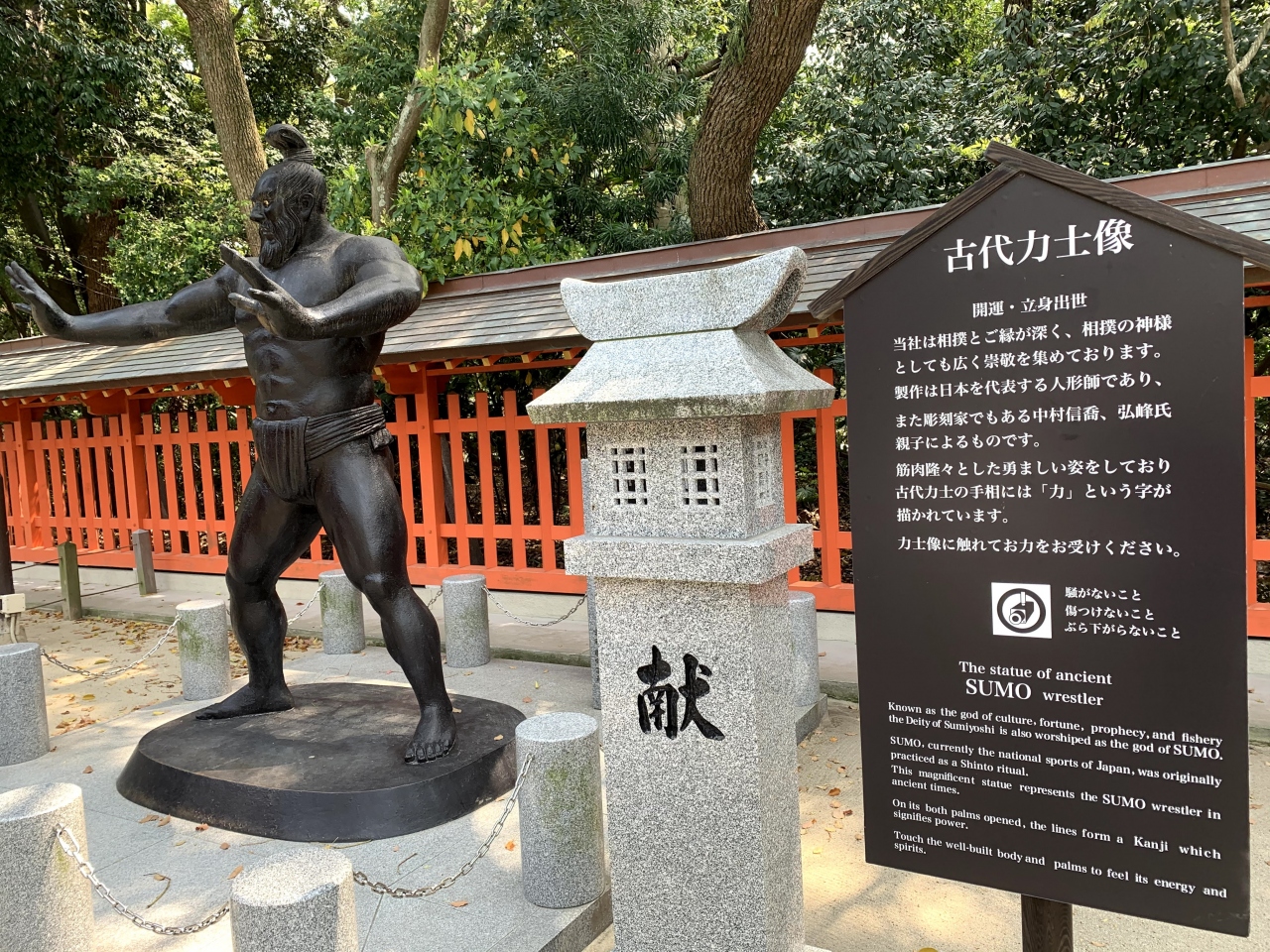 JR博多駅とキャナルシティ博多から近く、歩いて数分の距離です。ビルが多いエリアですが、住吉神社だけは緑が豊かで、とても雰囲気のよい散策に最適な神社です。相撲にゆかりのある神社で、境内に相撲の像や相撲場所があります。