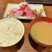 定食には、ご飯・味噌汁・小刺身・笹かま・漬物 付き