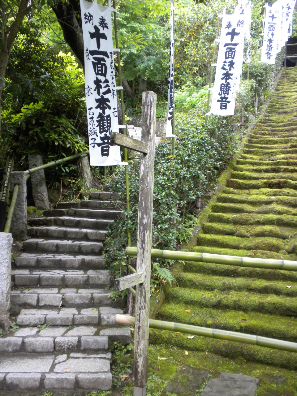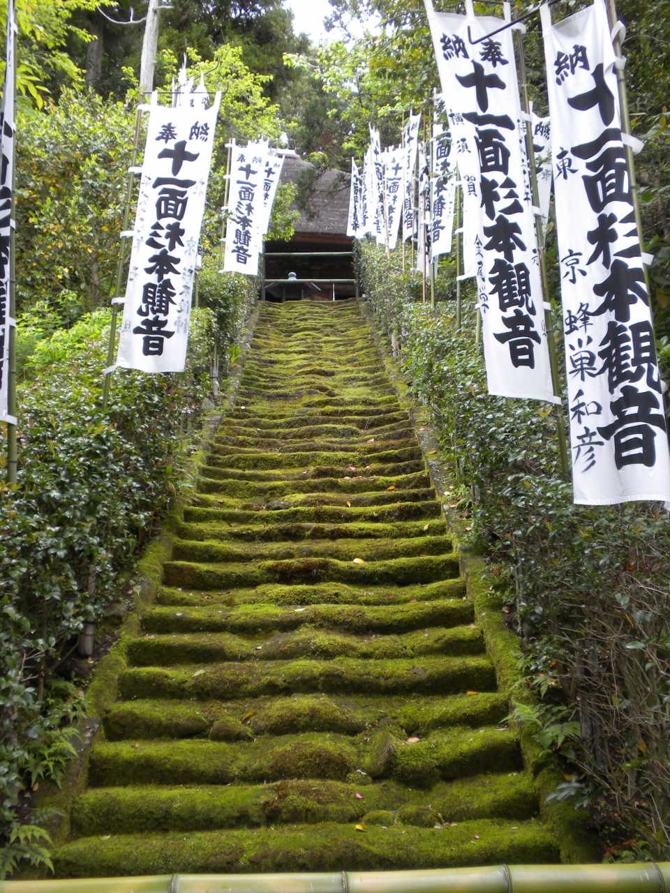 正面の苔むした階段は今では保存のため上ることはできず、脇に観光用の階段が出来ています。
