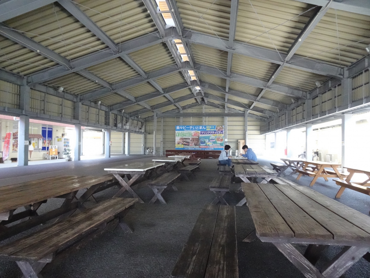中央の休憩所には大屋根があり、強い日差しを遮り心地よい風が吹き抜け快適な場所です。駅内で好みの食料を色々物色して休憩所で食べるのもお薦め。