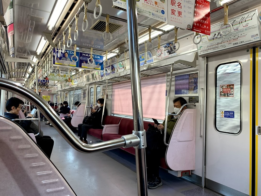 朝の通勤時間帯の上り電車に乗車しました。新型コロナウイルスの影響で成田空港を利用している人が激減していると思われ、スーツケース持参のお客さんは皆無でした。