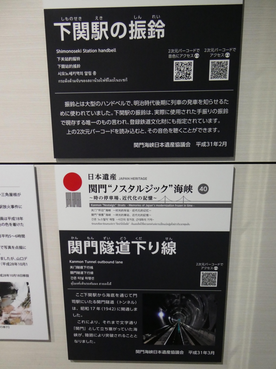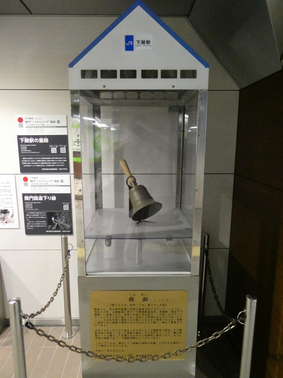 連絡通路には下関の観光に関する展示も多数有って観光客も楽しむことが出来ます。訪問時はつまようじアートで下関の古写真の景色を再現した物や昔駅で時刻や列車の到着・出発を知らせていたベル(振鈴)が展示してありました。