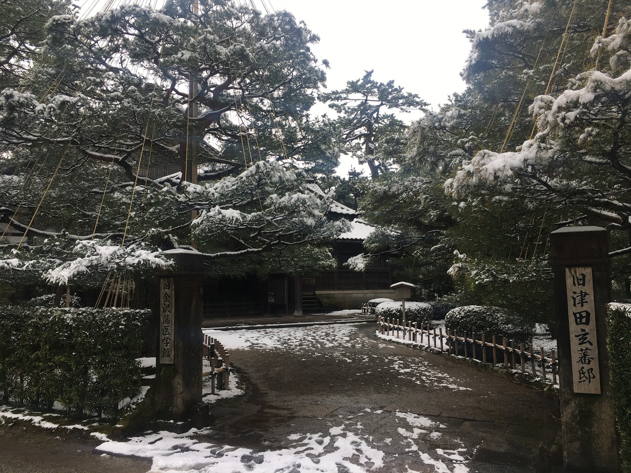 兼六園の随身坂口近くにあります。兼六園の敷地内ですが、入園料はかかりません。加賀藩の家老をしていた津田玄蕃の屋敷で、現在は兼六園管理事務所として使われています。何度も改修工事が行われているようですが、歴史が感じられる外観でした。