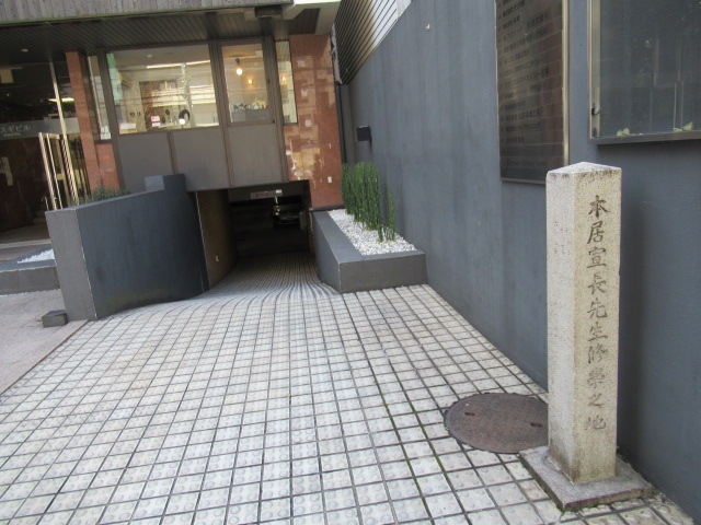 本居宣長は江戸時代の国学者です。1730年に伊勢国松阪の商家に生まれ1752年から7年間を京都で過ごし、堀景山に儒学を、武川幸順に医学を学びました。この石碑はその修学した場所を示すものです。簡素な石碑ですが歴史を語るものです。