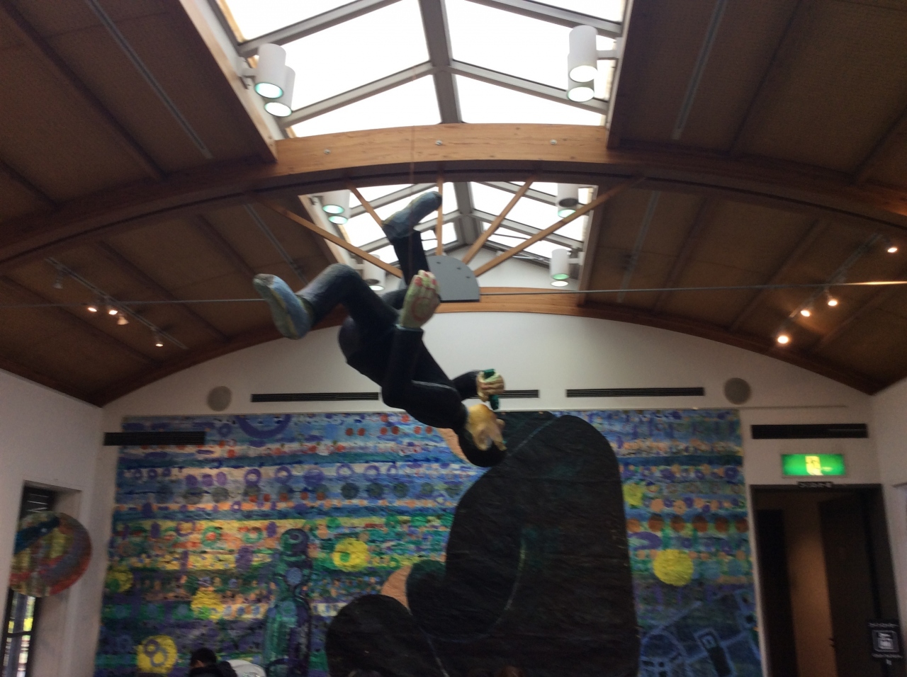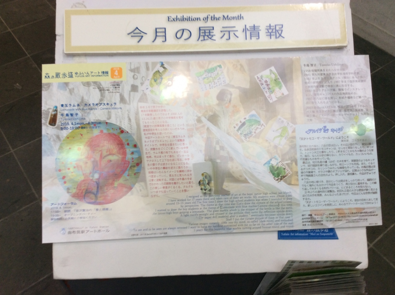 JR由布院駅の改札を出た左側の大きなスペースです。天井が高いスペースの下にテーブルや椅子を配置して待合室になってますがここで数々の作品をテーマ&期間ごとに入れ替えて展示しているので列車の待合時間で楽しむことが出来ます。