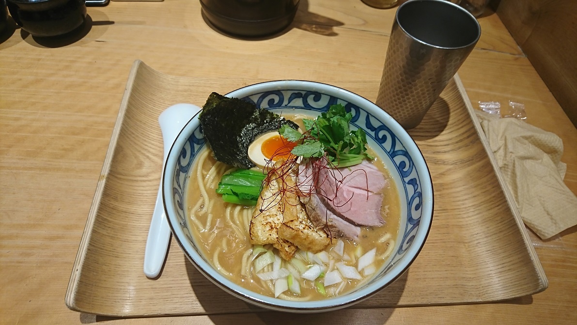 中央区銀座6丁目の細い路地裏にある割烹料理屋さんの様な造りのラーメン屋さんです。夕食で酒粕濃厚そば1100円をいただきました。具は海苔1枚、チャーシュー、煮卵、青菜、厚揚げ、ミツバ、ネギで見た目にも美しい盛り付け。麵は中太ストレート麵で、少しドロッとした酒粕の香りのするスープの一品です。生まれて初めていただく酒粕の香りのするスープでしたが、予想外にさっぱりとしていて、かなりの美味。創作料理の様なラーメンでしたが、満足しながら完食しました。ご馳走様でした。