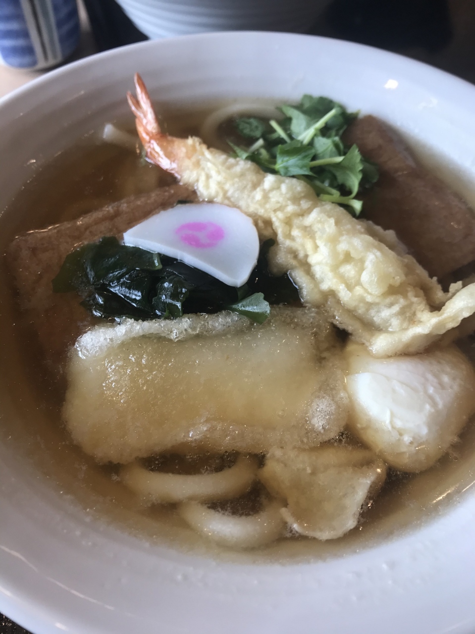 最近できたセルフのうどん店です。注文方式がセルフなだけで、席まで持ってきてくれます。きつねうどん550円、梅とじうどん680円、大阪太鼓うどん780円、牛大鍋煮込み180円を注文。うどんは出汁がしっかり効いていて、ちゃんとしたうどん屋のうどんです。太鼓うどんは、エビ天、玉子、餅、きつね、鶏肉が入っています。牛煮込みは正直蛇足でした。