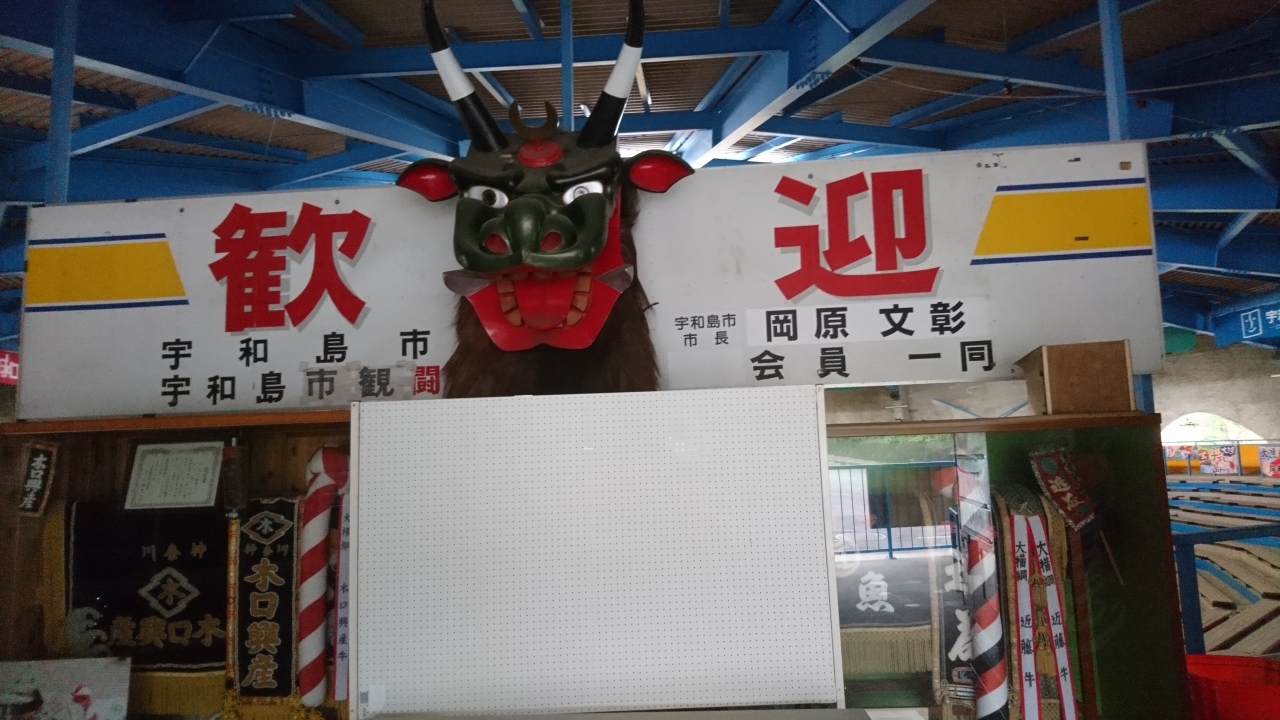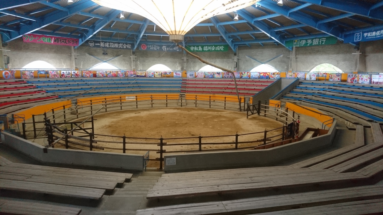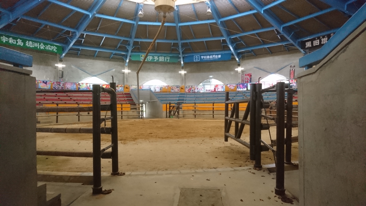 宇和島市街は、あまり広くないので歩いて観光をしていました。列車の時間があったので、少し足をのばして市営闘牛場に行くことにしました。 市営闘牛場は、山の上です。地元の人に行き方を聞くと、一番早く行ける道は墓地を上がっていくものでした。早く行ける方が、良いので急な墓地の坂を上がっていくとありました、 宇和島市営闘牛場です。しかし、この日は、闘牛は行われていません。外だけ見て帰ろうとしたとき、中から、市営闘牛場を管理している方が出てきました。そして、中を丁寧に案内してくれました。闘牛の開催日ではないので、特別に牛が入って来る通路や闘牛場まで行くことができました。親切なスタッフさんのおかげで大変、貴重な体験ができました。