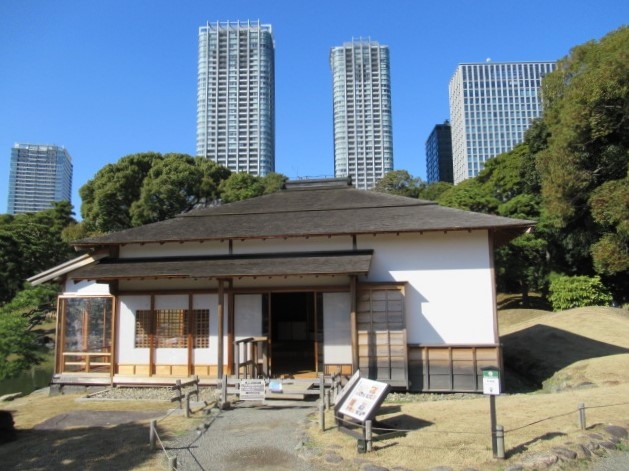 「浜離宮恩賜庭園」の最大の見どころは「潮入の池」とその周辺にある4つの御茶屋でこの「燕の御茶屋」はそのひとつで11代将軍家斉の時代に建てられた御茶屋です。歴代将軍が生花や座敷飾の観賞や菓子すしなどの食事、和歌を詠む場として、また接客の場として利用されていました。「燕」の名称の由来は燕形の釘隠金物が使われていたことや燕子花が由来とも言われています。当時の建物は空襲により焼失しましたが平成27年に復元されました。この付近には他に「松の御茶屋」「鷹の御茶屋」もありますので是非ご覧なってくださいね。また松の御茶屋と燕の御茶屋を巡る御茶屋ガイドツアーもあります曜日に注意くださいね。詳しくはHPまで。