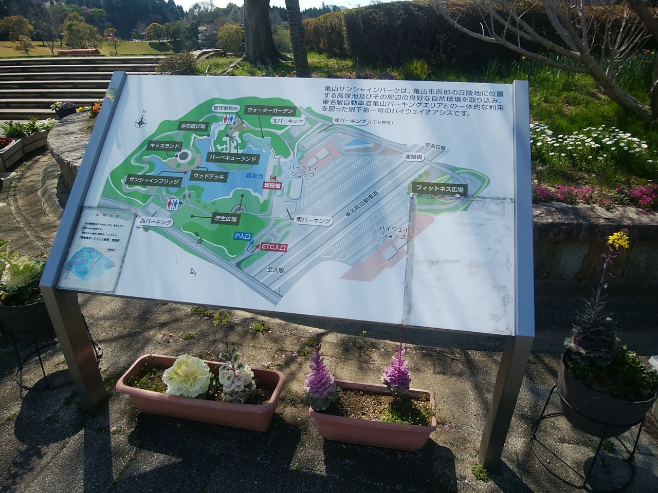 亀山パーキングを利用した時に、隣接している亀山サンシャインパークを散策してきました。高塚池の周回に散策路ができていて、きれいに整備されています。バーベキュースペースや、芝生公園、子供の遊ぶ広場などもあり1周散策しても15分ほどでできるのでちょっと運転中の息抜きにもいいところだと感じました。