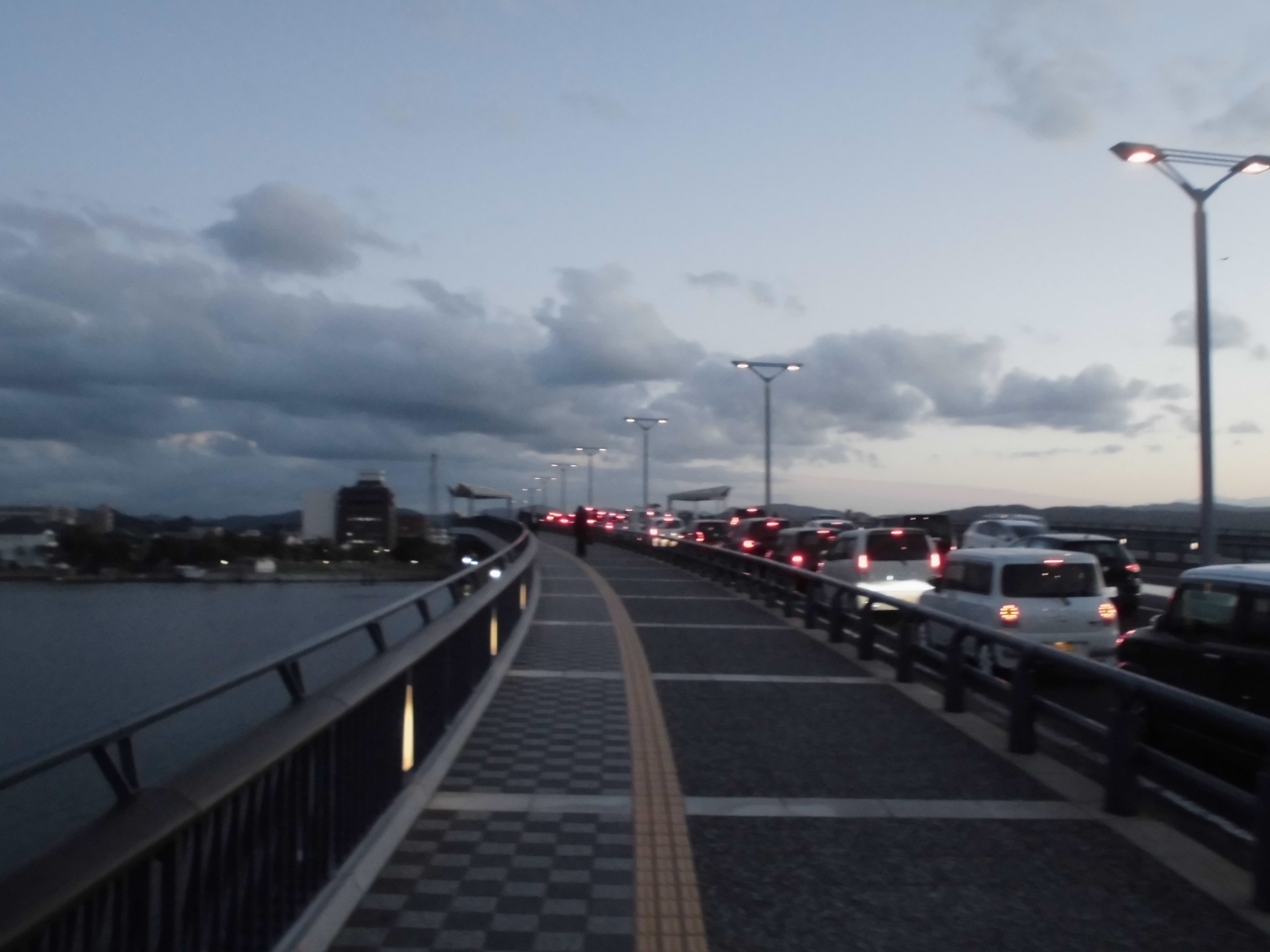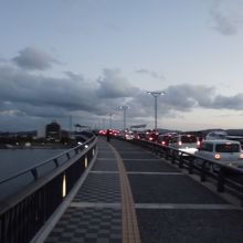 松江は宍道湖と大橋川で南北に分断されています。両岸をつなぐ橋はいくつかありますがその最西端にある橋です。この橋を北上すると松江城につながる交通の要衝です。ホテルをこの橋の近くにしたので客室から見えました。見るといつの時間帯も車がたくさん行き来して、この橋の重要性に気づきました。
