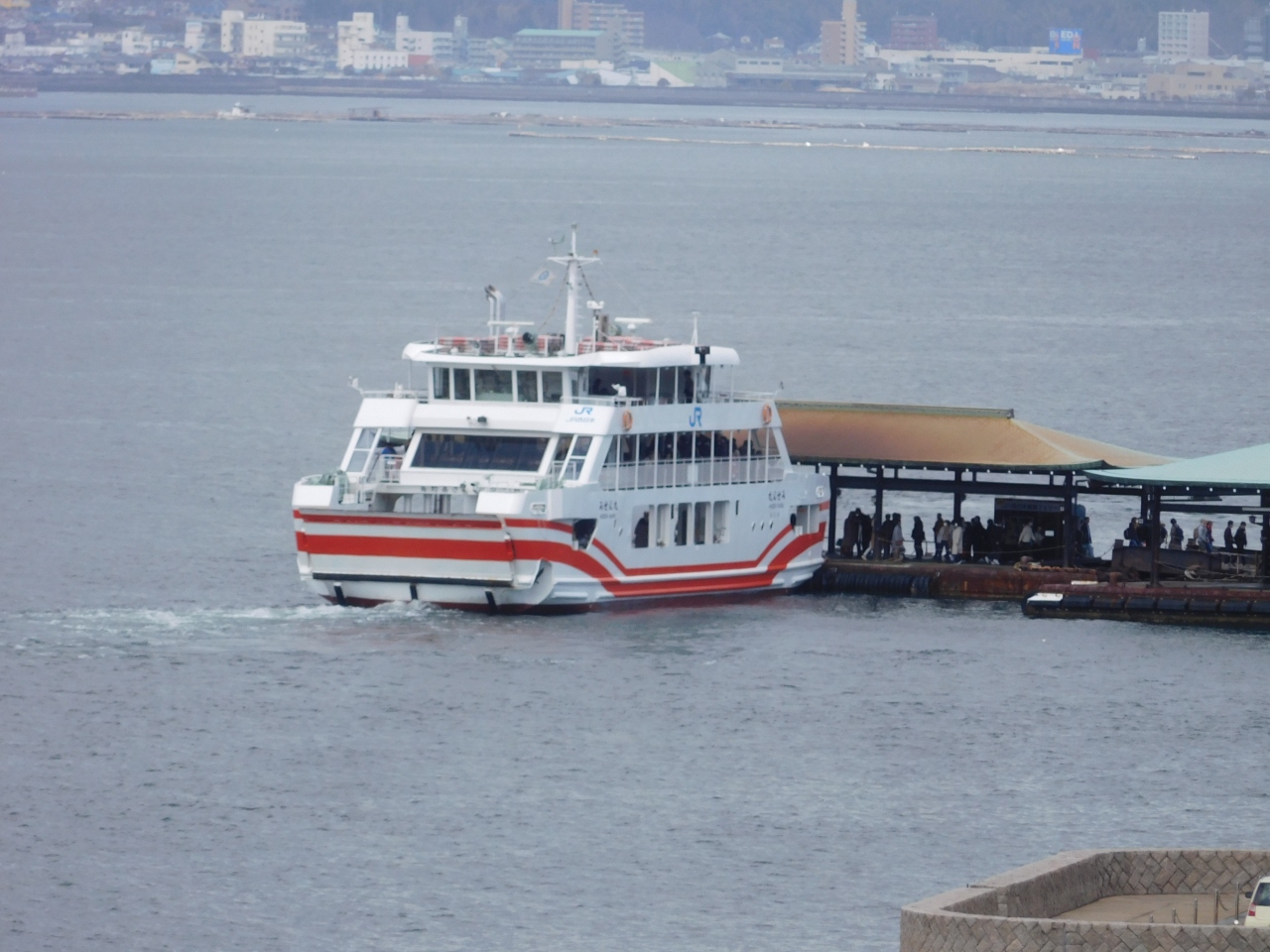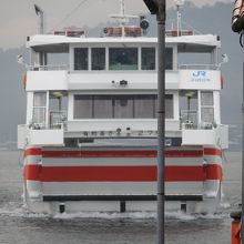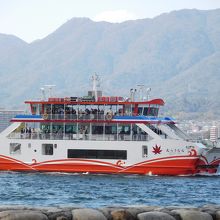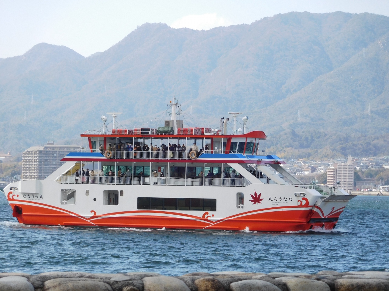 JR宮島口駅近くの駐車場に車を停め、宮島へはフェリーで渡りました。電車に乗るような感覚の値段で利用する事が出来、室内の席や、外に出て景色が楽しめるデッキ席などもあり、一度に多くの乗客が乗れるようになっていました。行きは、大鳥居のすぐ近くを通るルートの「大鳥居便」を利用し、展望デッキ席から眺めましたが、大鳥居が修復工事中だったのがちょっと残念でした。全国の交通ICカードも使え、気軽に便利に利用出来て良かったです。