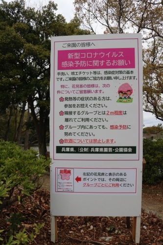 花見をするための距離を空けるため?サクラの木の下に、注意書きが敷かれていました。