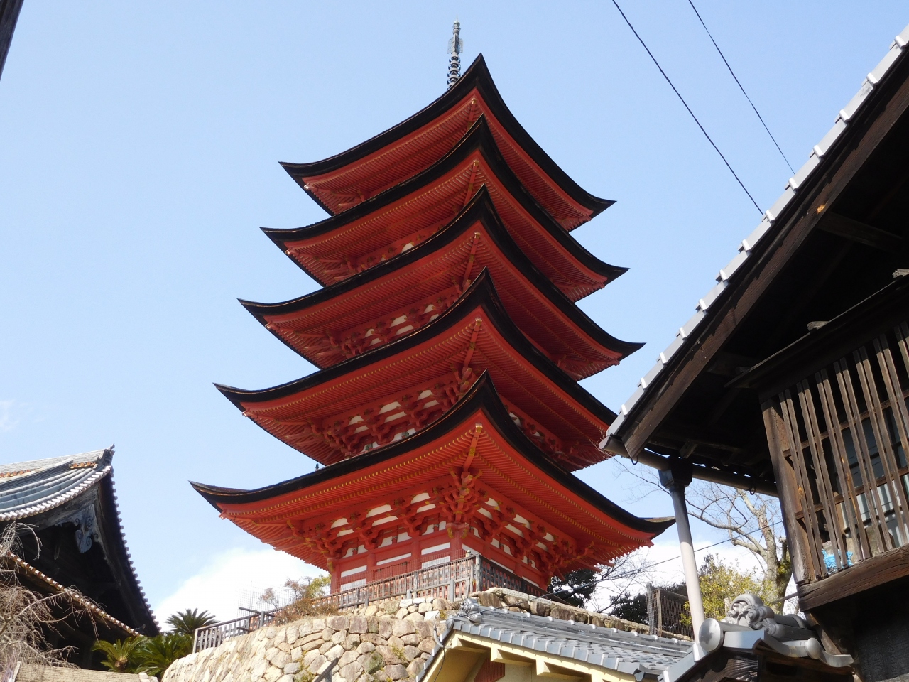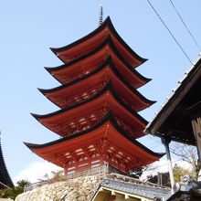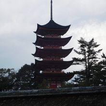 厳島神社近くの高台に建つ「五重塔」は、高さ27メートルで、宮島のいろいろな場所から見る事が出来ました。厳島神社に参拝した後、五重塔の近くまで行ってみましたが、近すぎると全体の写真が撮れないので、写真を撮る場合は、厳島神社の回廊から撮った方が真正面に位置する写真が撮れて良いと思いました。内部は見学が出来ない為、外観のみの拝観となります。