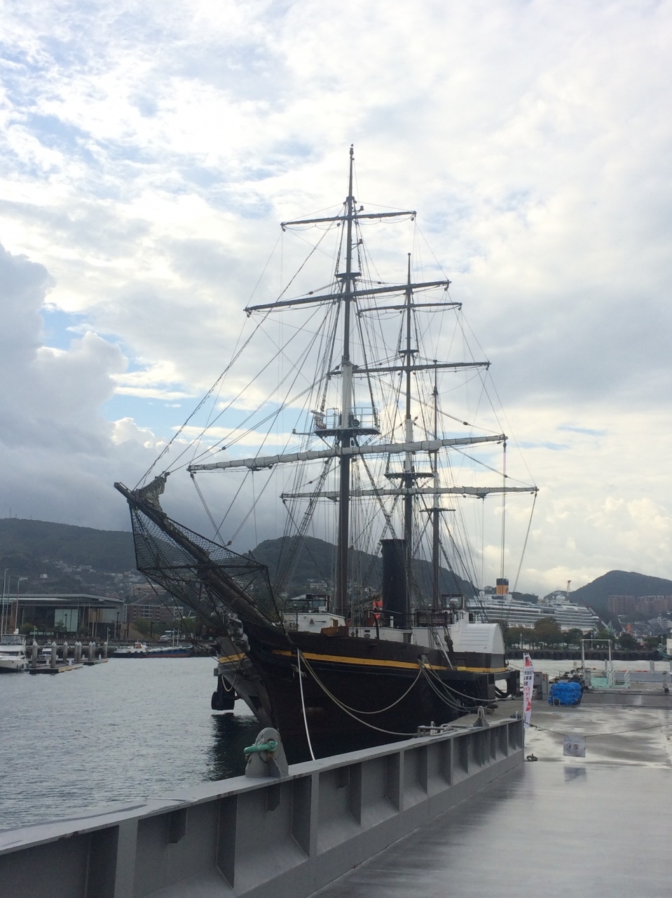 長崎港にある船です。幕末時代に日本をはしっていた船で、勝海舟や坂本龍馬も乗ったという歴史があります。蒸気帆船なので、マストがはるタイプの船です。私達が訪ねた時は、早朝の天気が悪かったので、帆はしまわれていました。