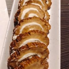 今回は、新得地鶏のもつ焼き・いぶりがっこ十勝産クリームチーズ添え・熟成肉の厚切りベーコン・湯葉揚げ・焼きハマグリを注文。