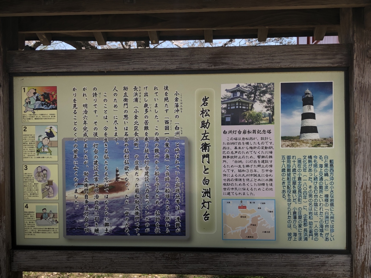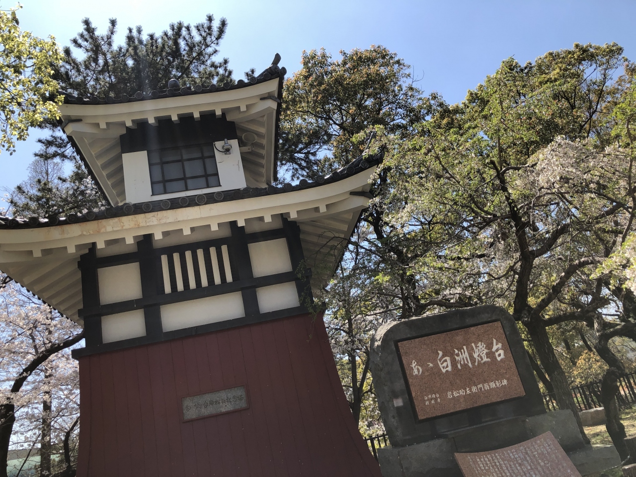 勝山公園を桜見物しながら歩いていて見つけました。何だろうと近づいて見たら、櫓のようでした。良く読んでみると、岩松翁という人が、難所に、自費で、白洲灯台を建てた偉業を