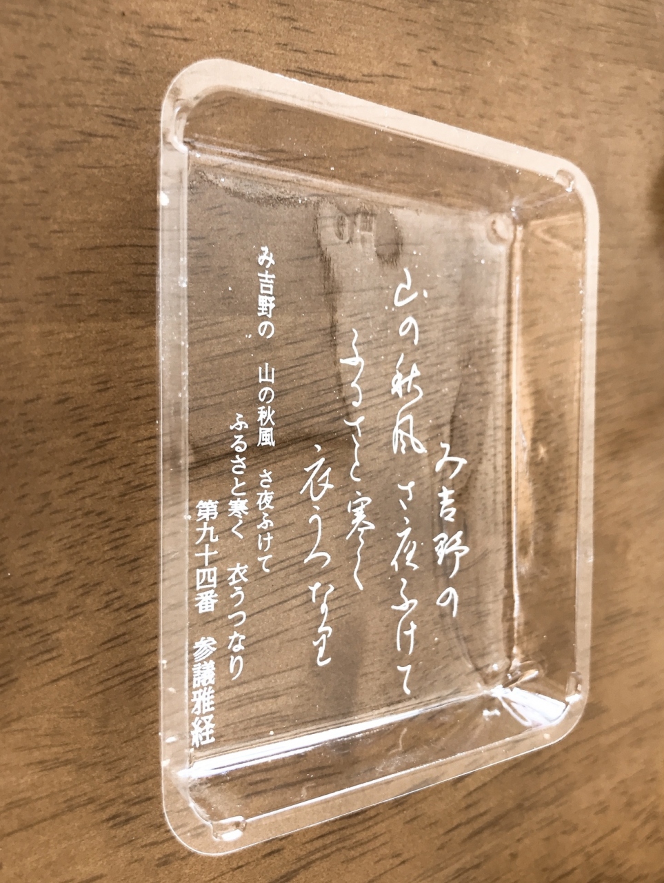 袋の中は一口サイズの数種のせんべいが入っており食べやすいです。透明なトレーには歌が印刷されており最後まで楽しめました。袋は少し透明で手触りがよいです。