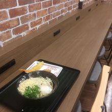 吉野家と客席部分を共有しており、通常はなまるうどんでは貯めることのできないTポイントをカード提示で貯めることができます(使えるかどうかは確認しておりません) レジ横に掲示してあったので申し出てやってもらいましたが、何も言わなければそのままだったのかなと思うと少し気分は複雑です。カウンタータイプの席にはコンセントもあり充電も可能ですね。