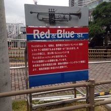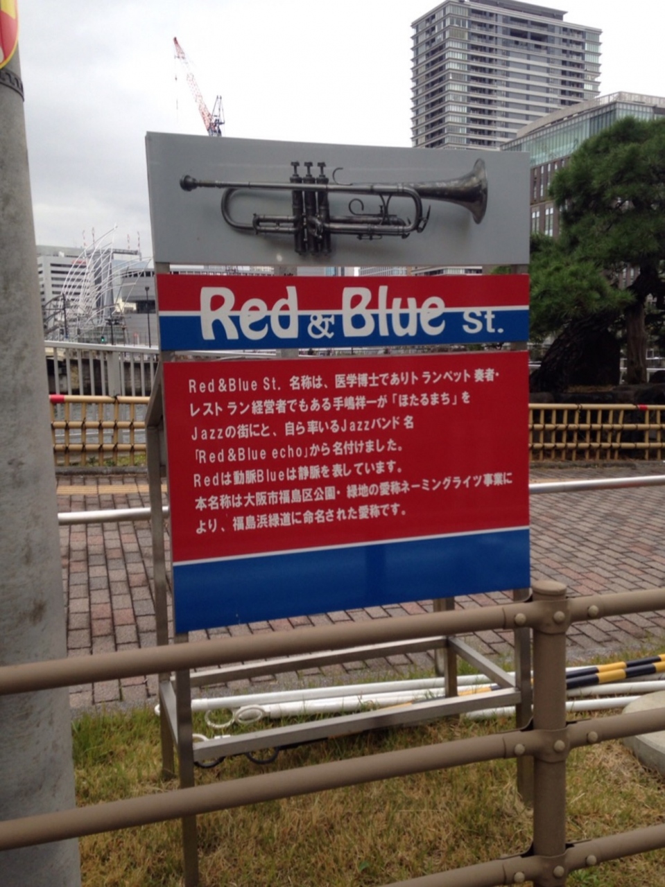 堂島川の田簑橋から玉江橋の間辺りにある遊歩道です。元々は福島浜緑道と言って、Red&Blue Streetはネーミングライツで付いた名前のようです。車道の脇にある歩道とは別に、さらに堂島川側に寄っているので対岸も良く見えて歩くのが気持ち良いです。