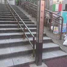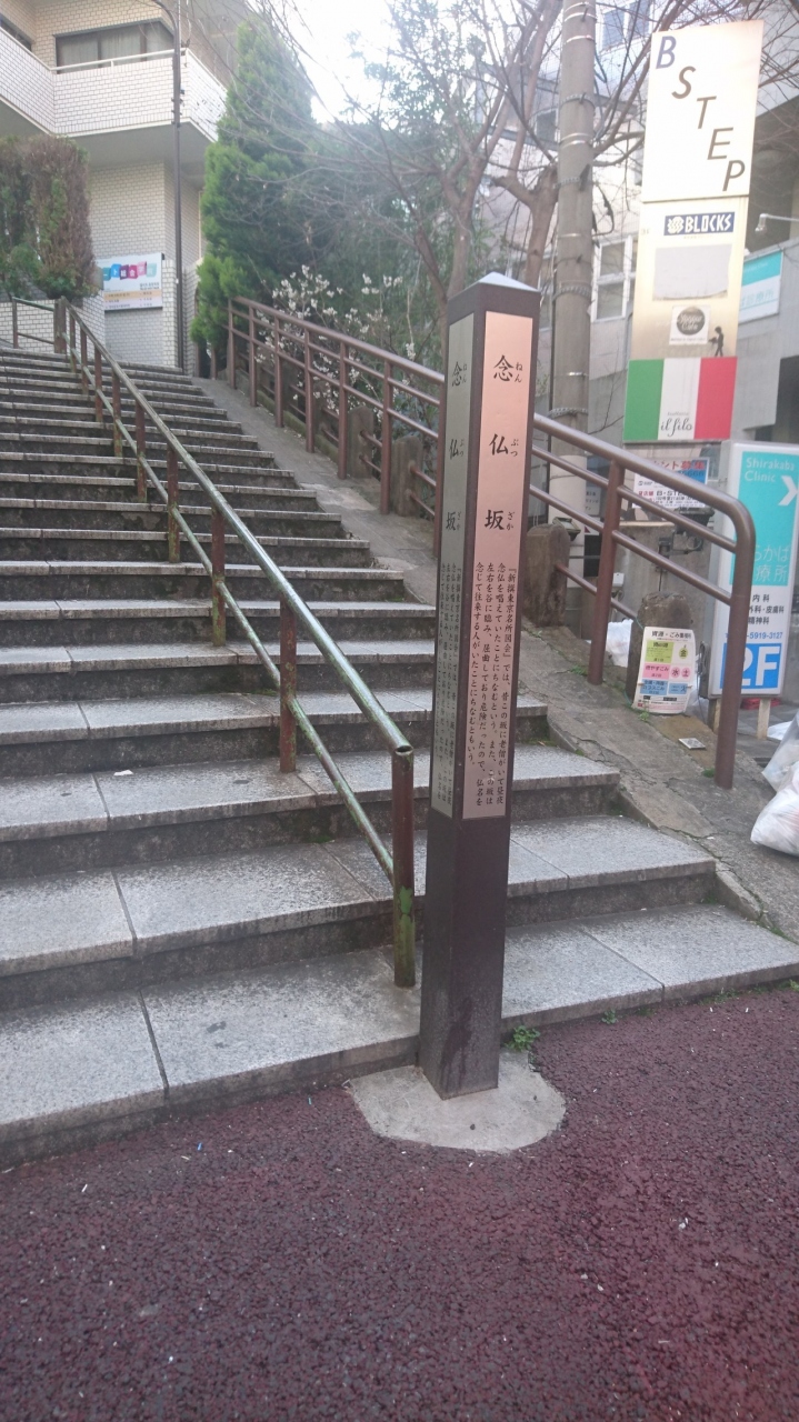 都営新宿線曙橋駅で初めて降り周辺散策をしました。大きな町があるところではありませんが、交通量の多い通りにあり、たくさんの人が行きかっていました。駅から北側に5分ほど歩き、右折して狭い路地に入ると、その先に左にカーブする変わった名前の階段坂道がありました。坂下には「念仏坂」の標柱が建っており、かつては昼夜念仏を唱える老僧がいたそうです。