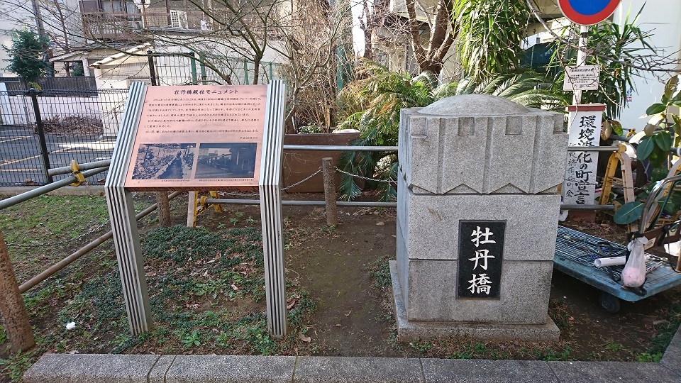 錦糸町駅南口から徒歩5~6分程度、墨田区江東橋の首都高速道路下に牡丹橋親柱モニュメントがあります。かつてここには竪川が流れ、牡丹橋という橋が架かっていました。いくつか竪川に架かる橋はあったのだと思いますが、何故かこちらの牡丹橋の親柱だけが保存されています。有名な橋だったのでしょう。