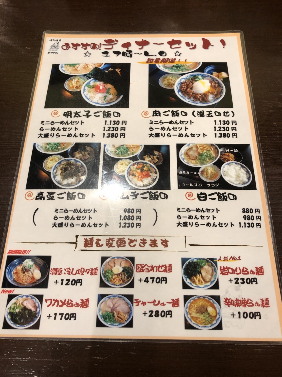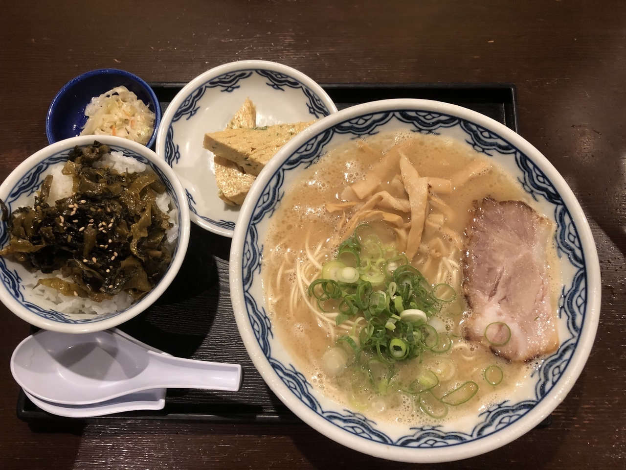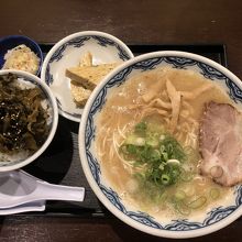 高菜ご飯ディナーセットを注文しました。極細麺ですが、釜炊きの豚骨スープがからみます。