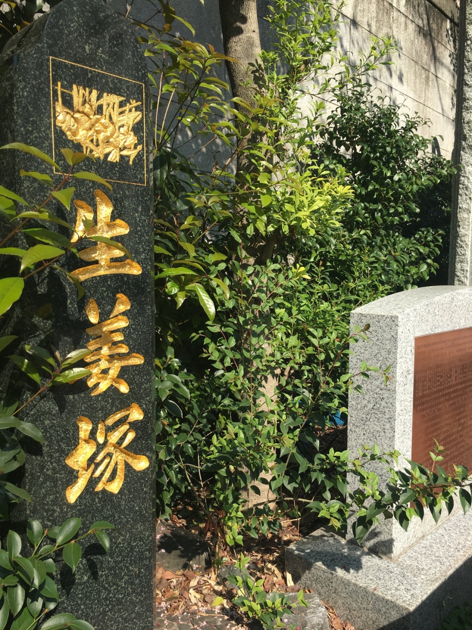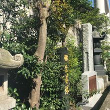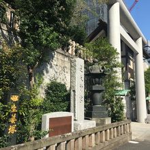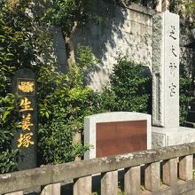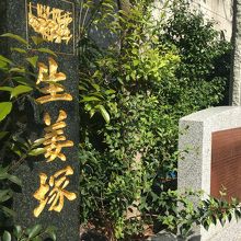 黒い硯のような石碑に金色の文字が書かれていて、その上に生姜の絵が描かれていました。左右には草木が生え、芝大神宮の境内に入る手前の左側にあります。金色の文字がやたら目立ち、それ意外は特に特徴がなかったです。