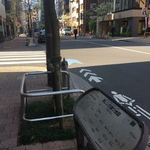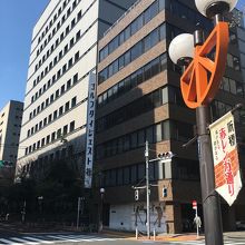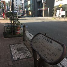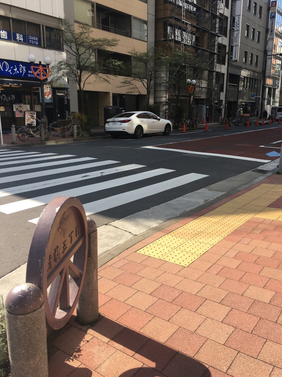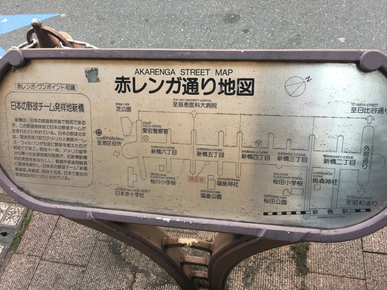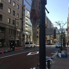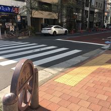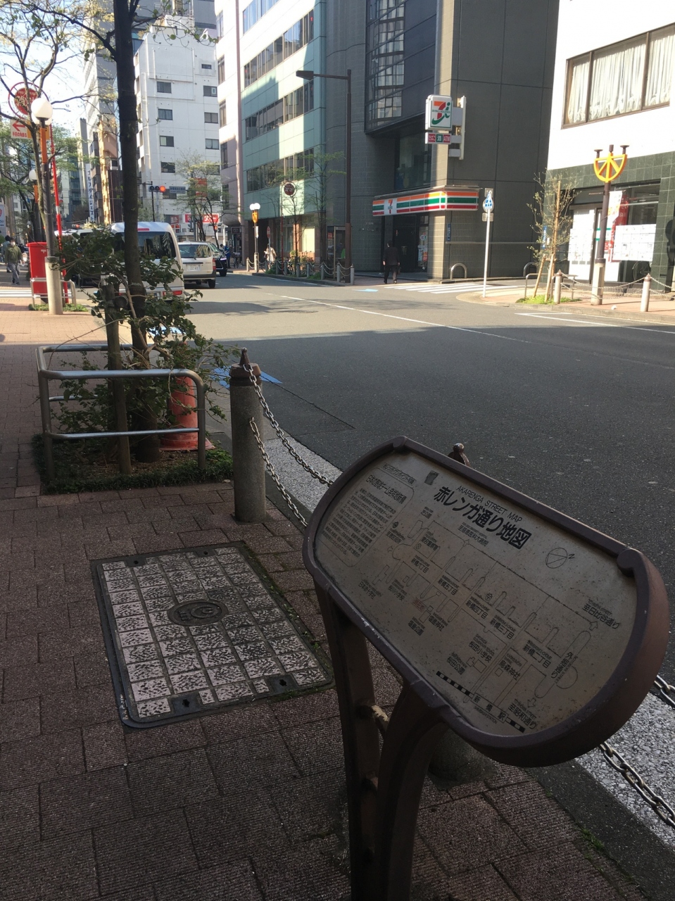 左右は歩道で、ビルがびっしりとつならっていました。ところどころに、鉄道の車輪のようなものが展示され,簡易的な地図があり、赤レンガ通りと書かれた幟があります。中央は車道ですが、車は多くなかったです。良く見かける通りでした。