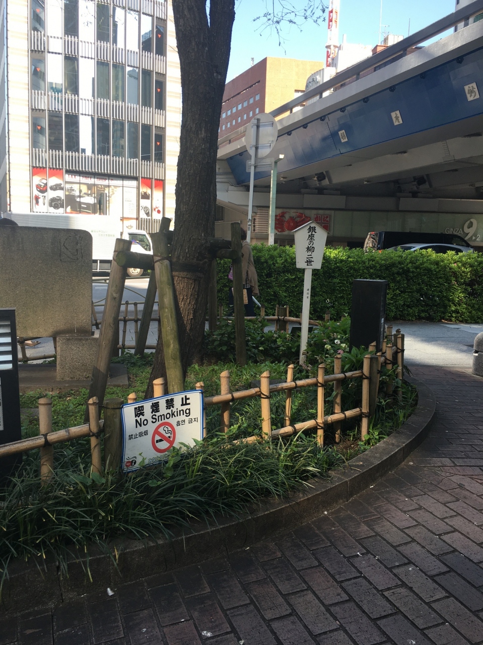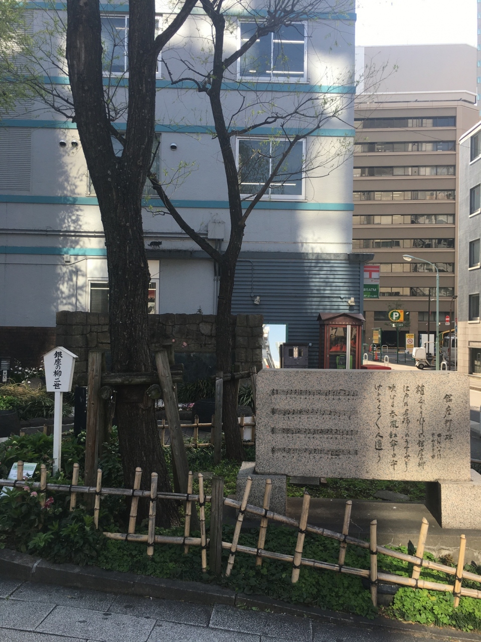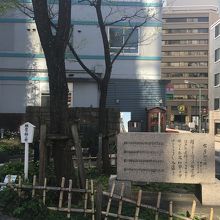 白い棒に五角形の看板がありました。隣には石碑がありましたが、柳の木は見当たりませんでしたが、細長い木がありました。周りを囲って草が生えている以外は何もなく特に見どころがないところでした。人通りが多い場所にあります。