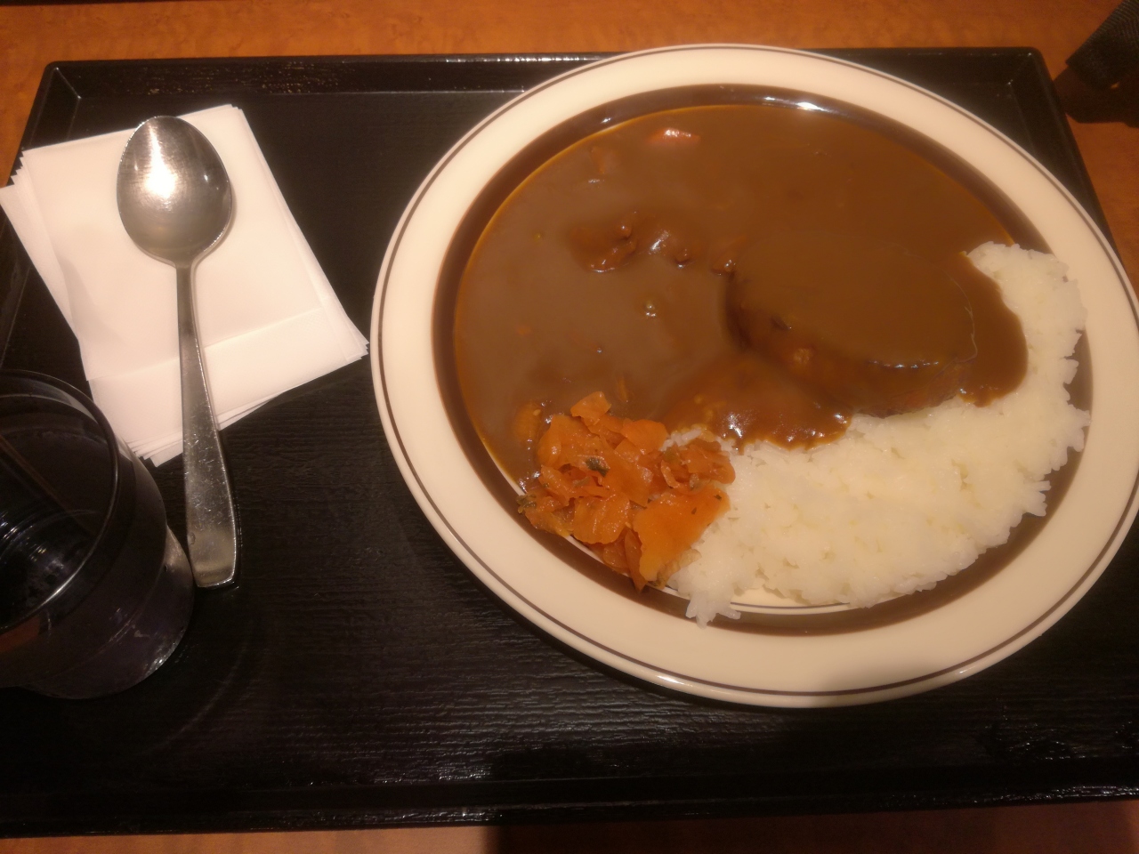 このセルフが曲者。以前は食券を買って1分位で着席でき、すぐにカレーを食べ始められたが、新方式ではカレーを用意してもらうまで5分程待ちました。