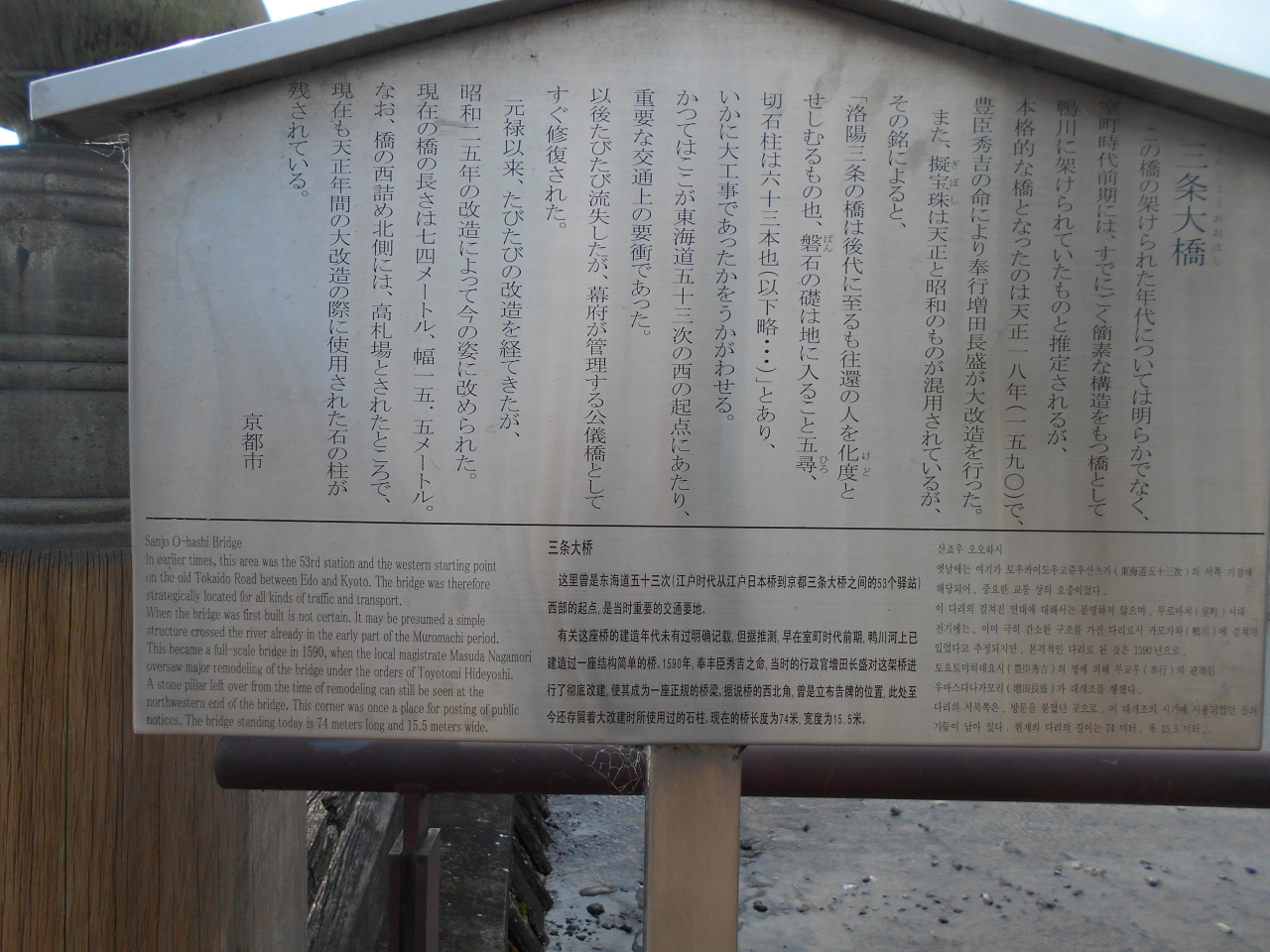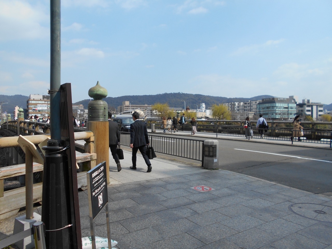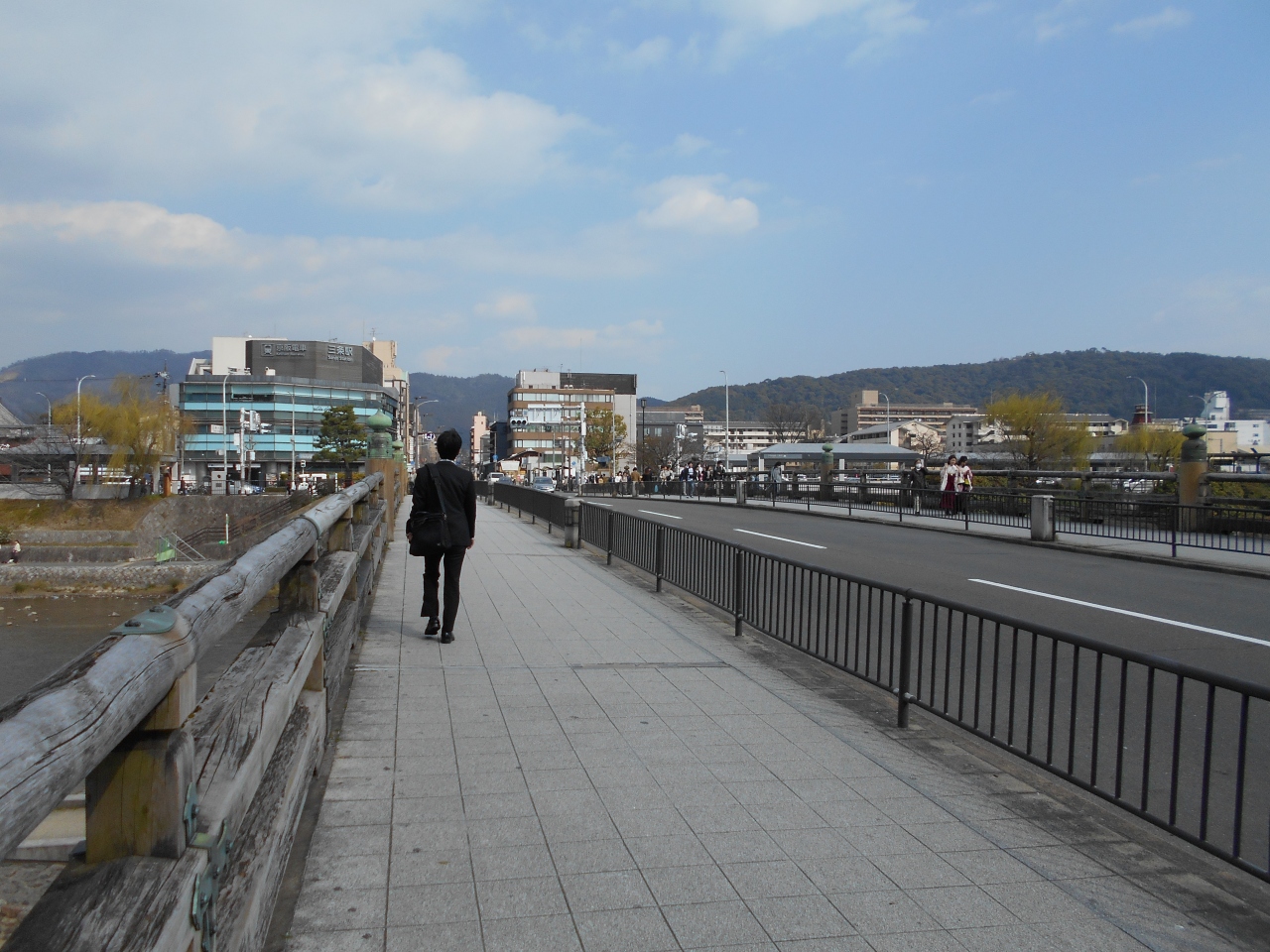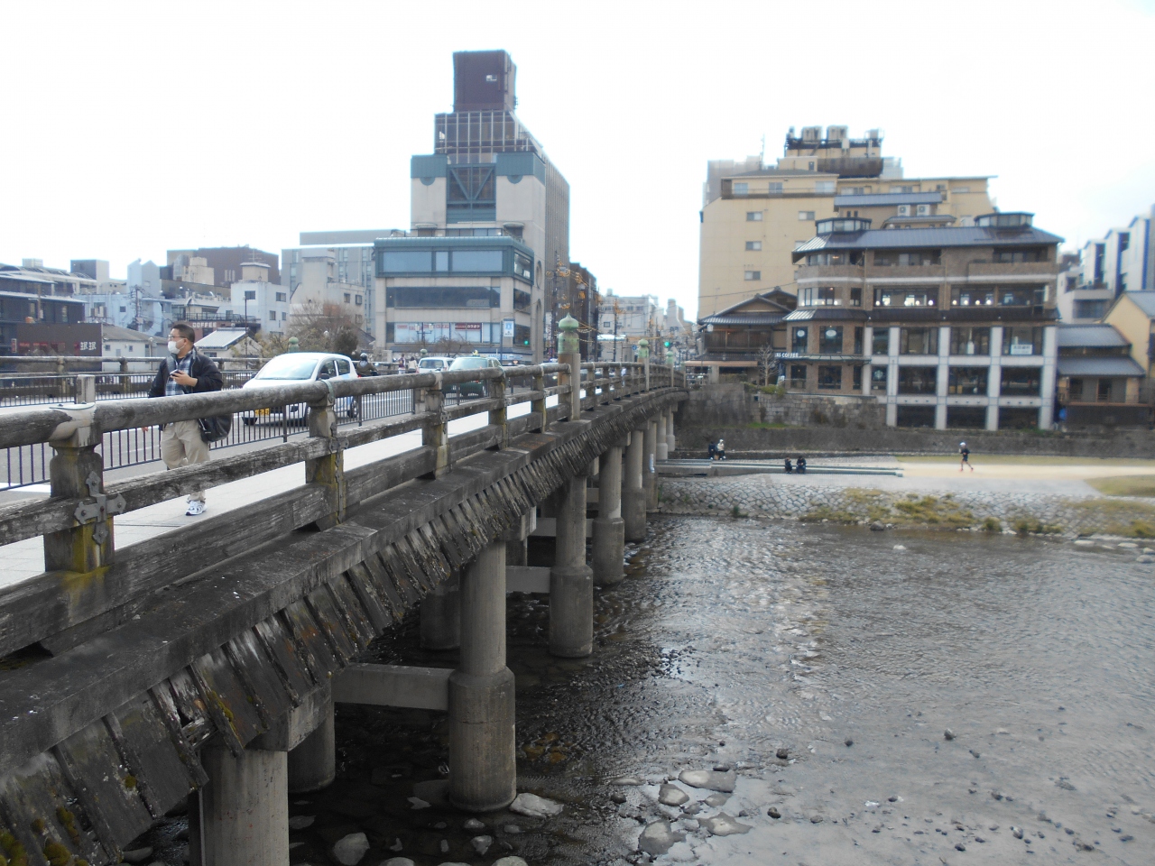 三条通の鴨川に架かる大橋で東海道の起点とも江戸からは終点とも言われる歴史ある大橋です。天正18年(1590)秀吉の命によって増田長盛が奉行として石柱橋として架けた物だそうです。現在も石柱は使われています。鴨川を挟んで東西には歴史のスポットや先斗町など優美な場所も並んでいます。木橋が何とも言えず雰囲気があります。