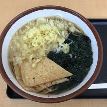 郡山駅一階にある立ち食いそばの店です。あさかそばをいただきました。油揚げ、揚げ玉、ワカメなどがそばに載っています。地味ながら美味しくて、夢中で食べてしまいました。駅そばとして、充分合格点です。サイドメニューの豚丼なども気になりましたが…