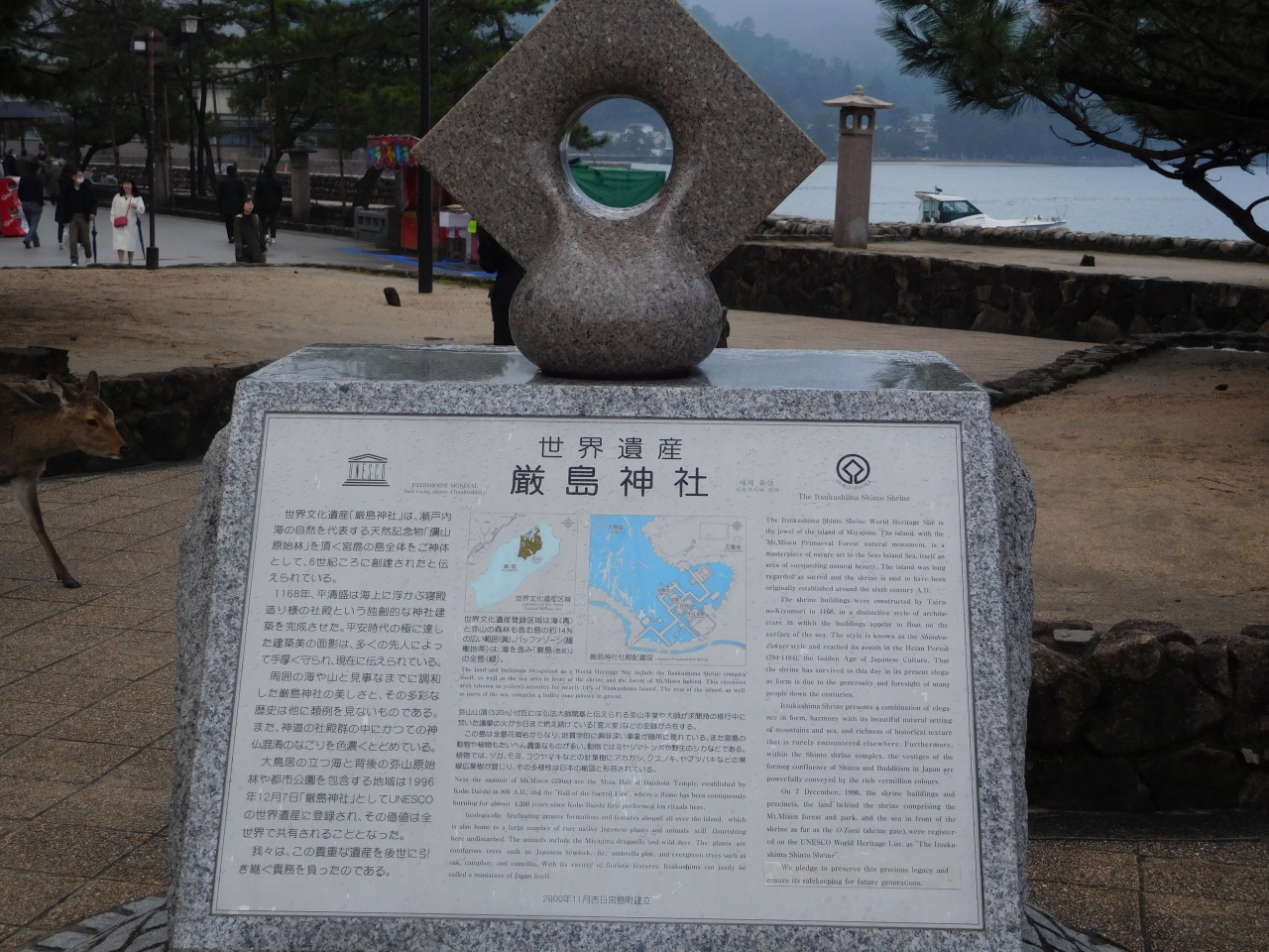 フェリーの発着場である「宮島桟橋」から、厳島神社方面へと向かう途中にある「厳島神社世界遺産登録記念碑」です。厳島神社についての解説が、日本語と英語で書かれていました。近くの人が映り込まないように写真を撮っていた為、その時は気付きませんでしたが、上の穴の空いた部分から大鳥居が見えるようになっていました。