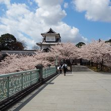 兼六園の入り口と隣り合っているメインの入り口である石川門につながっている橋です。この橋は金沢城まえの大通りの上に設置されていました。4月の上旬に訪れましたが、ちょうど桜が見ごろの時期で、ピンク色でとてもきれいでした。