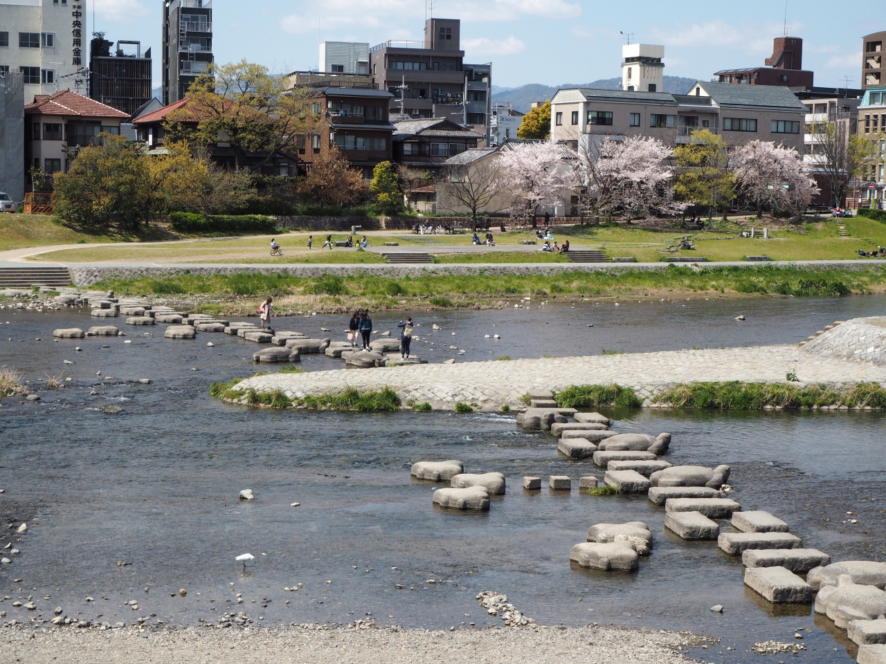 京都御苑の北側から東へと歩いて行き、下加茂神社へと向かう途中に、鴨川を渡りました。鴨川と高野川の合流地点は公園になっていて、平日の昼頃ですが、天気がいい日であったので、わりと人出もありました。鴨川沿いの土手には桜の並木になっていて、ゆったりと座って桜を眺めたり、桜の並木道を歩くのは気分がよかったです。