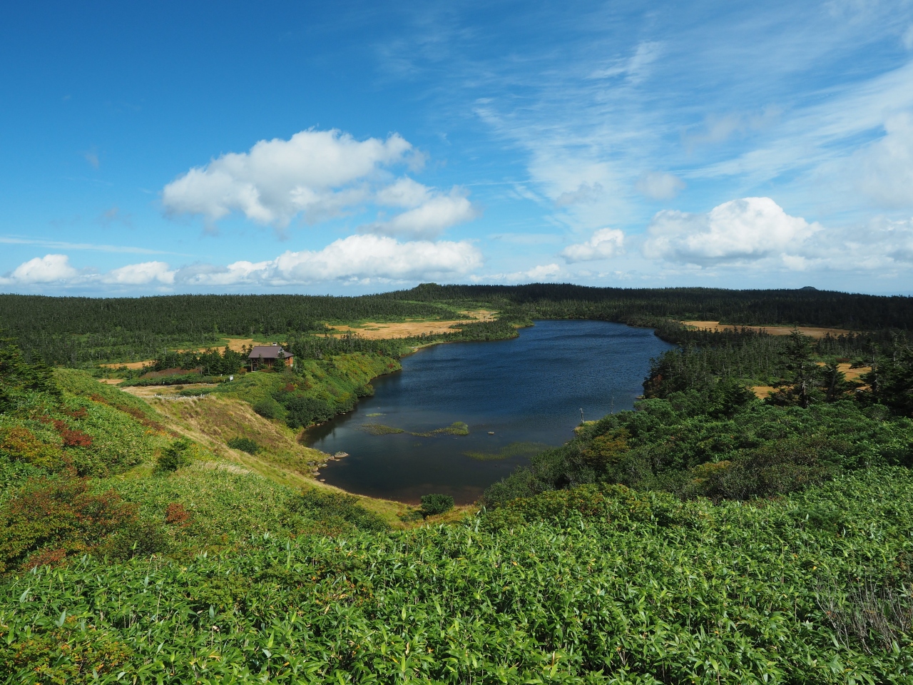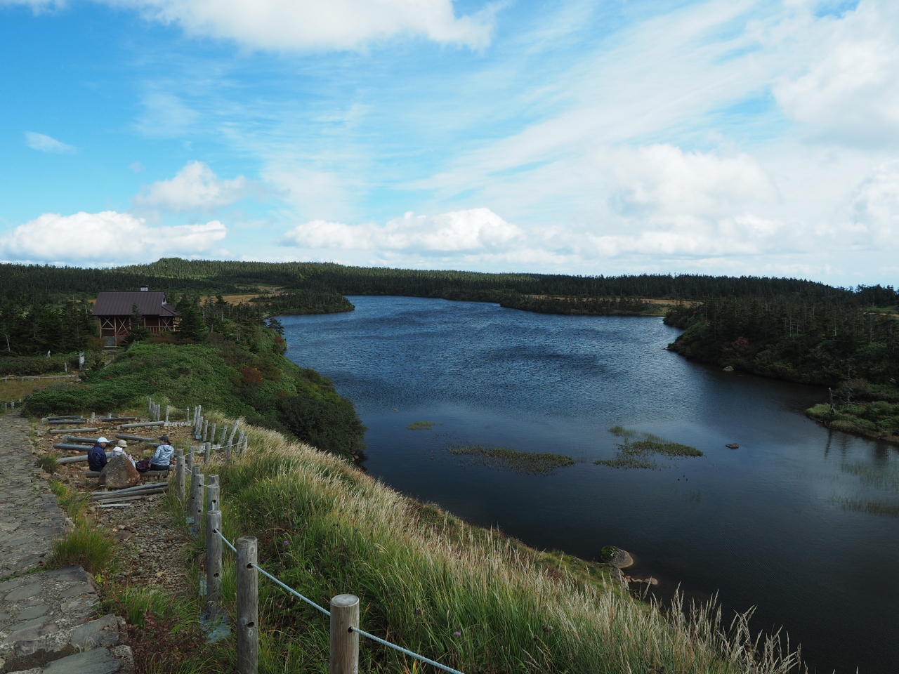 2年前はガスであまり見えなかった八幡沼ですが、今回は晴れたので存分に楽しめました。やはり展望デッキからの眺望が抜群。定番の撮影ポイントになりますが、八幡沼と周りの緑、草紅葉が美しい。そして青空と雲が近くに感じ非常に心地いい。晴れているとこれだけ印象が変わるのかというほど素晴らしい景色でした。沼畔にはベンチもあり、ここで弁当を頂くとより一層美味しく感じます。